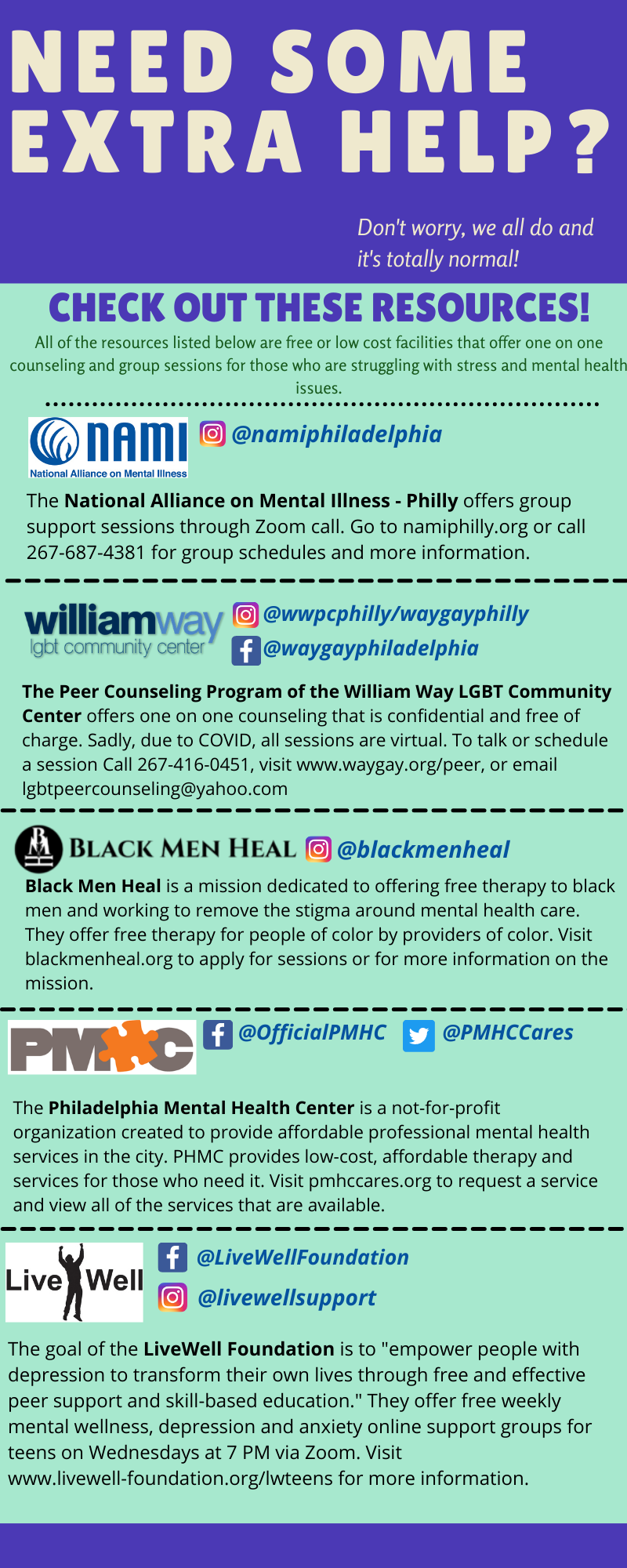 Throughout my four years of high school, I have been noticing that many of my peers and myself were struggling mentally. However, a lot of the people that were struggling, were not receiving help. So, I decided to focus my capstone around the issue of mental health among teens and the stigma around therapy. I created an infographic that has information about free and low cost therapy/counseling options in the city of Philadelphia. Additionally, I had the pleasure of interviewing Dr. Jane S. Kennedy. She is a social worker at the Children's Hospital of Philadelphia. We discussed possible root causes of issues, the stigma around therapy, and her personal experiences with patients.