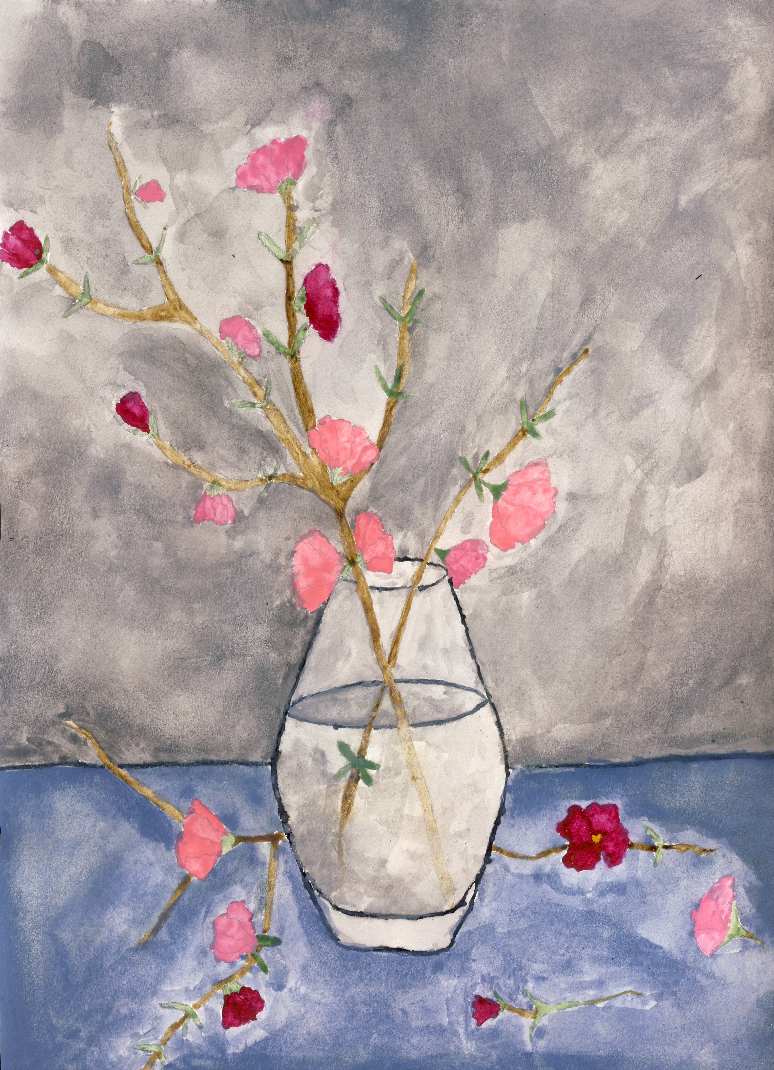 For my quarter 4 benchmark, I chose to model my work after the artist I chose, Kathleen Dunphy. She does a lot of watercolor paintings and I based my artwork off of hers. I created a vase with flowers and a dark background with a dark blue table/floor. The flowers were pink, magenta, and burgundy. I used simple, different sized paintbrushes and a canvas that is used for watercolor. The larger ones were used for filling in a lot of space quickly while the smaller ones were used for getting in tiny spaces a little more precisely. I drew a sketch first and then I started working with trying to mix up a desirable green that would work for the stems. I then used red and a mix of a few other colors to get a pink, magenta, and burgundy. I don’t specifically remember the colors I used for it but I got a good outcome. I don’t normally use watercolor for my artwork, and I wanted to try something new and I liked the outcome. Something I wish I did differently was me using the paint like it was acrylic rather than watercolor. With watercolor paint, you can use the already dried paint on the paper to get a certain effect or use more color. I’m used to acrylic paint because I’ve been using it since last year and I like deep colors rather than semi transparent colors so I wasn’t used to using it.