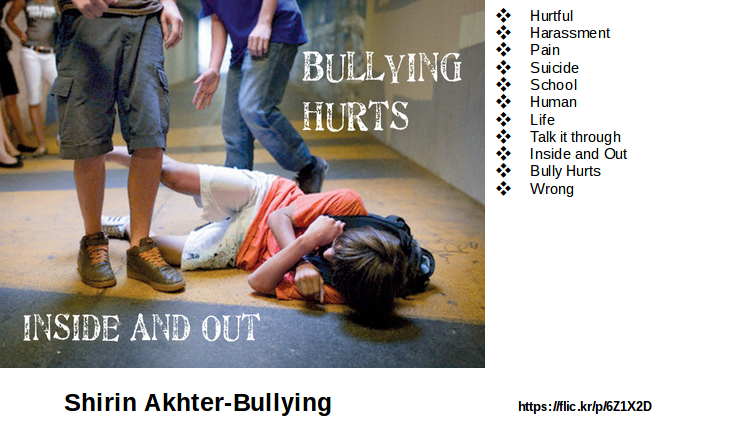 Bullying is wrong. A lot of people commit suicide because they can't get rid of the people or the problem isn't going away. Bullying is harassment and it should be stopped. People get hurt and they feel pain inside and out. It’s good to talk to someone about it, but most people don't do that because they think its going to make it worse. Bullying is a part of life, in our life's there is a moment when we felt harassed or we felt that someone hurt us, and we need someone to talk to. Most people are being bullied at school because of what they were or if they are a nerd. I think it shouldn't matter if a person is a nerd or popular, all humans have different personality and we show it in different ways.