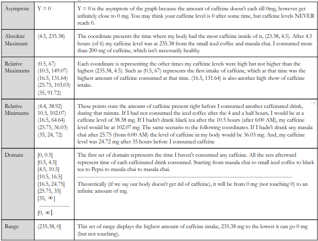The first equation (in red) was y=67(0.87)^x-0.5 of masala chai, drank after 30 minutes of 6 o’clock in the morning. It consisted of 67 milligrams of caffeine. However, the 67 in the equation derives from the amount of caffeine at 6:30 AM, saying we drank and finished the masala chai at 6:30 AM.