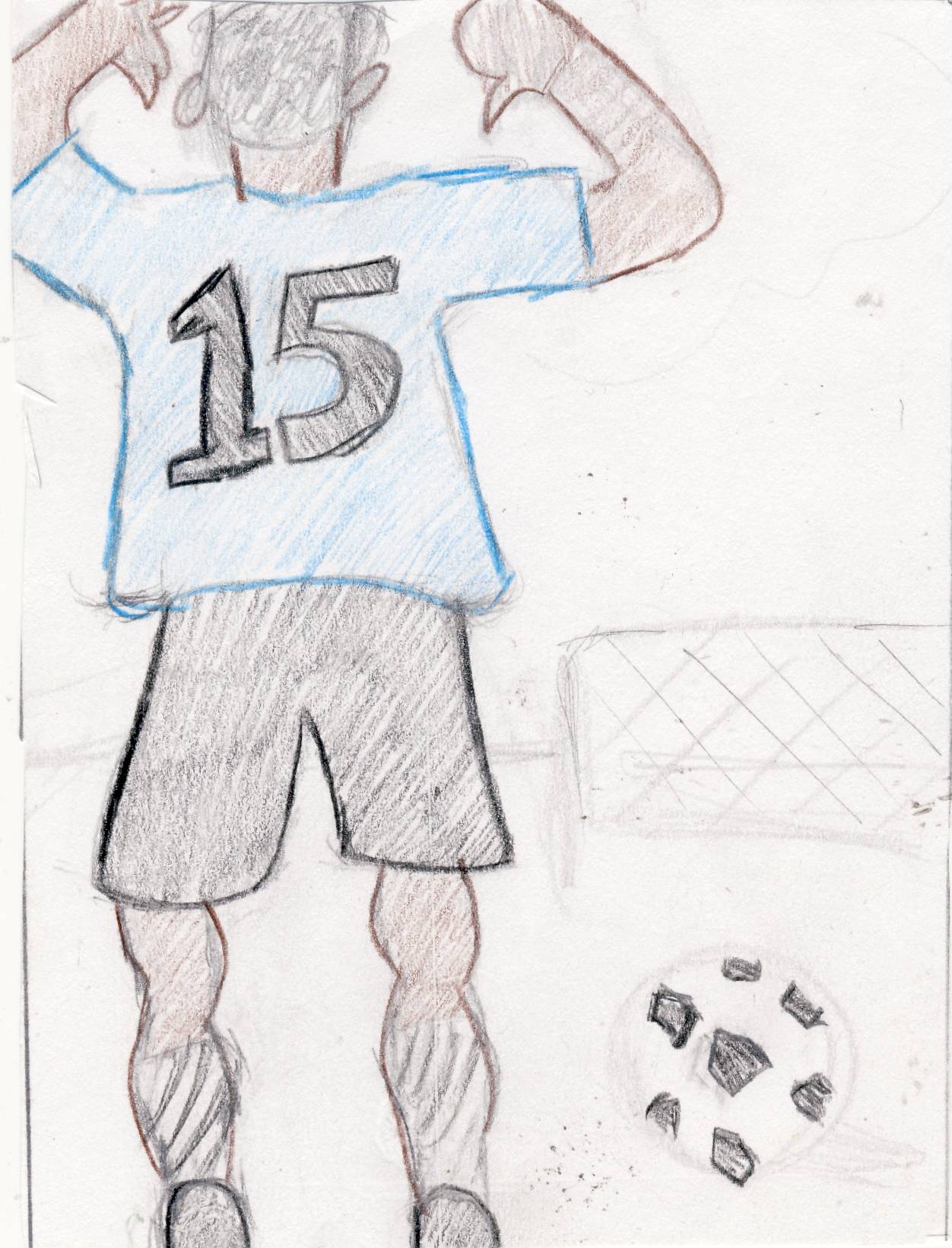 In the art piece that I created, it represents a visual of one of Science Leadership Academy Beeber students; Jhakur Hall. It portrays him on the soccer field with a ball and goal net in the distance. He is pointing to his jersey number “15” to distinguish hom from his teammates. I wanted this piece to in some form communicate the community of our SLA soccer team, by displaying one of its’ players. I made the piece very simply by just a led pencil and four colored pencils. To be completely honest, this someone aligns with my other pieces as being finished just before set due date. I was not necessarily inspired by a painting artist, but rather sport photographers. The way they photograph athletes after, or during games made we want to cultivate such images. I experimented with detail in this project. Especially regarding the leg muscles, I tried to make it as accurate as possible. Such legs turned out to be my proudest depiction in my work. Included in my success of the art is how I looped around my weakness of drawing faces, so drawing the back of a head was so much easier, and a lightbulb moment. In reflection of my project, I would want to change the open space (or background) of my art piece. Next time maybe include field grass or other players. During this project I learned that portraits are not always, just a fact, but rather a representation of a perspective or opinion of something.