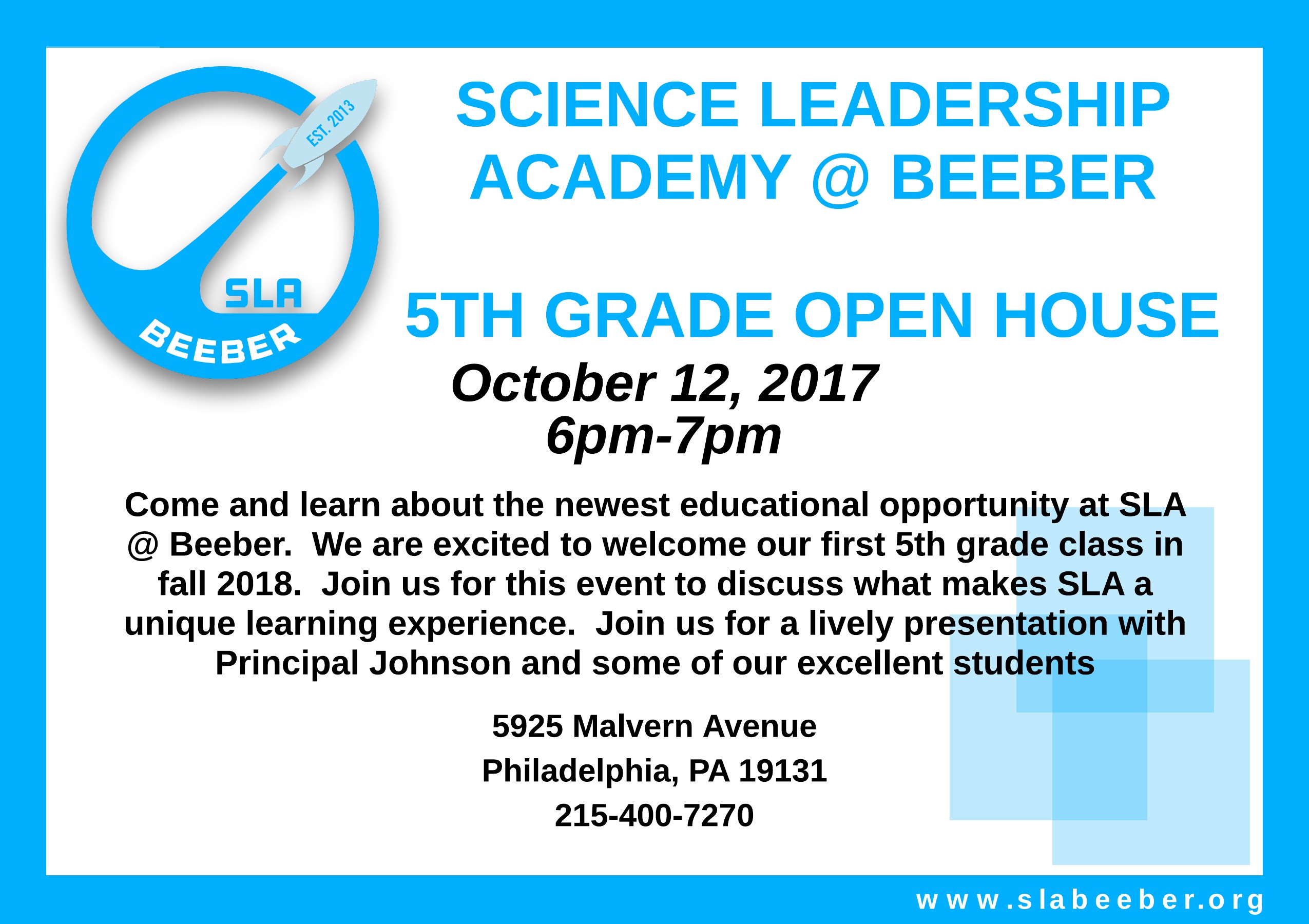 Science Leadership Academy @ Beeber is excited to expand to middle school in 2018. We look forward to welcoming sixty 5th graders next September. Interested families can learn more about the unique learning experiences that SLA @ Beeber offers at the 5th Grade Open House, Thursday, Oct. 12th from 6-7pm.