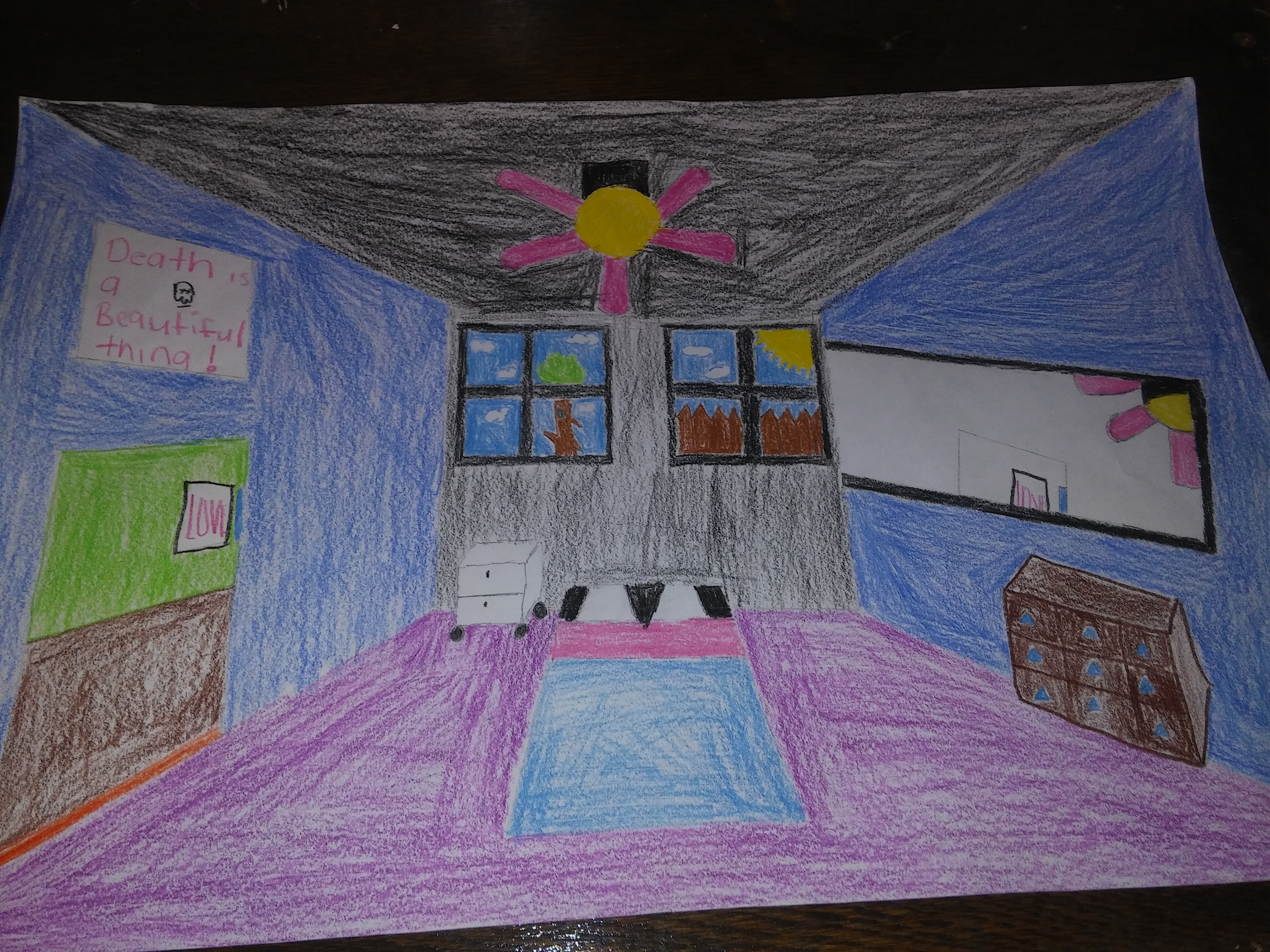My 6 word memoir is "Being bright doesn't mean I'm happy". I chose these words because it is the input for the way that I feel. Everyone sees me as this one happy person who doesn't feel pain. So I decided to design the room to match my personality, showing happiness with a little bit of darkness. I have colored the walls blue because blue is my favorite color, however I colored the ceiling an sheets black and the back wall gray. I've decided to do that because no one notices the little dark spots in life. I feel like I am trapped in the room of happiness but I am being forced in there while my head and heart aches of pain. I've also placed a photo above the door saying "death is a beautiful thing" because it shows how I feel about the dead.