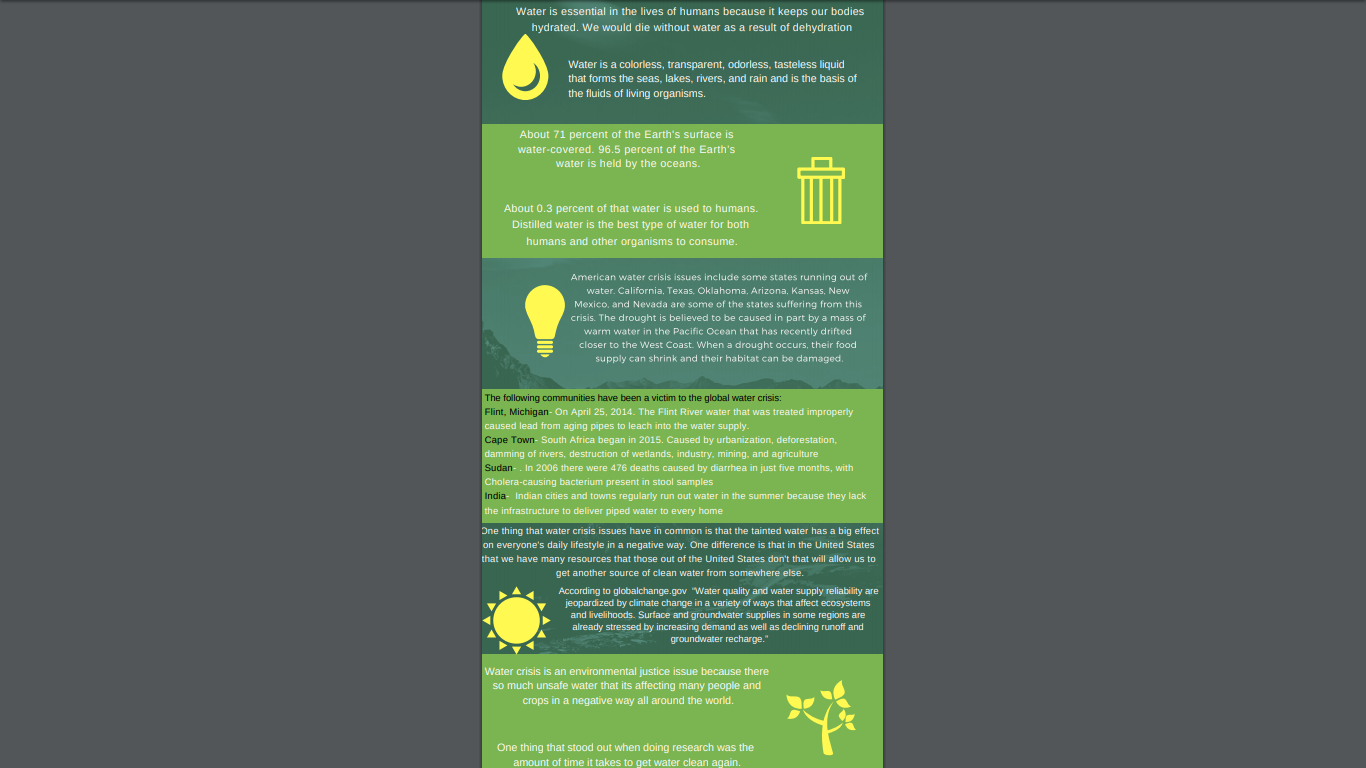 Global Water Crisis Infographic Posted by Bahiyah Corbin in Environmental Science · Aziz · C on Tuesday, December 18, 2018 at 2:22 pm Screenshot 2018-12-18 at 2.22.39 PM Comments No comments have been posted yet. Log in to post a comment.