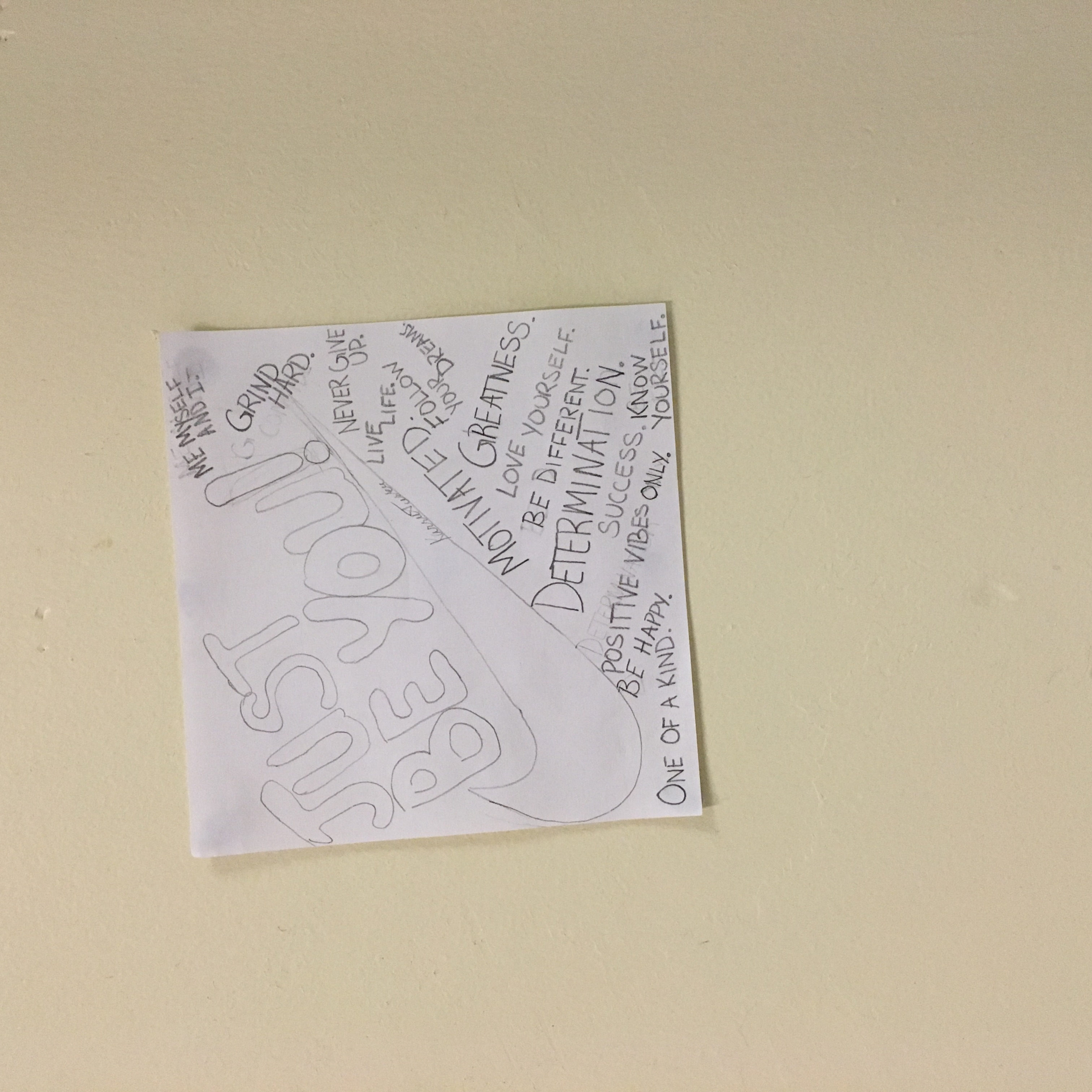 The meaning of this piece of art I created is just to be yourself, don't be afraid to who you really are. I think just the simple fact that many kids/teens are trying to be somebody that they aren't is what inspire me to make this piece of art. My work is inspiring and telling people that loo k at it that it is okay to be yourself. I chose this location because it stood out to me and it was an empty wall so I decided to add my work to it so that the wall wouldn't be blank anymore. This project just showed me that art can be any form of expression. As I travel around the city I look closely for street art.