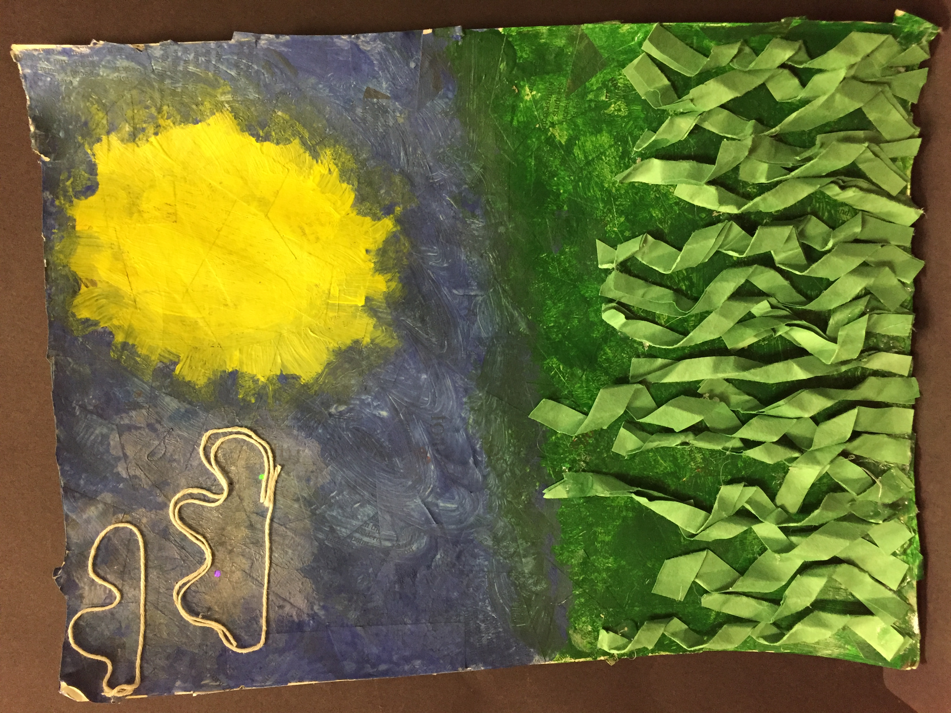 When starting to form my ideas as to what I was going to make, I started out by thinking about the different medias that I wanted to use. I thought about a lot of different things but in the end I decided that I wanted to use newspaper,string,paint, construction paper, and glue. Once I had the materials down I thought about what I wanted to make. I thought that the materials would make a good landscape picture . After that I got started using the materials and seeing how they worked together. I wanted the background of the picture to have the newspaper and than I would paint over that to make the grass and sky and things. And lastly use the string and paper to add to the picture making clouds and more grass.