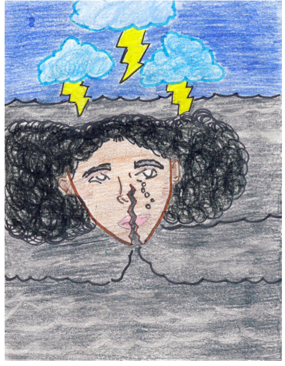 My art represents a younger me that is coming face to face with her present and future problems that begin to overwhelm her and drown. I drew a crack in her face so you would know that her problems are coming from within. I added lighting storm at the top because I thought it was creative. With the “problems” pouring out her and the fact that they’re black, it shows that I go through and that I'm going through something heavy that is hard for me to handle. The materials I mostly used were colored pencils and sharpies. With the “ocean” that are her problems that she faces, I trying to mimic the actual ocean.