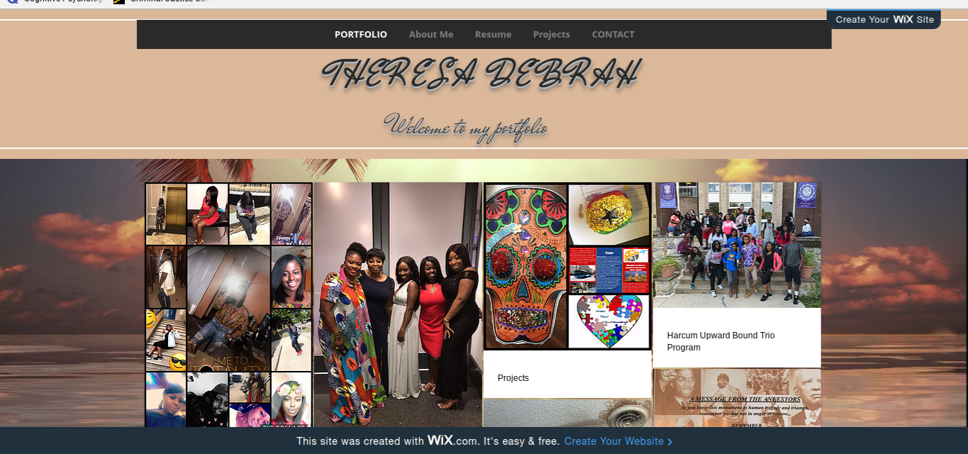 Welcome to my portfolio. My portfolio consist of information about me, my resume, projects and a contact section. When creating my portfolio, it was to have a set look for myself and for others to view and know. As a start, I began to do a layout within the wireframe. When it came to do the wireframe, it was easy for me. However, as I really started to create my website I changed my whole layout. I began to do my website on wix.com. I started to choose a background. I tried to pick out something colorful and bright but not distracting to my viewers. I decided to do a sunset background within images of myself, family, projects and programs that I am involved in. Meanwhile, creating information within my resume made me really think about what I’ve done and what can I do more in my community and in today’s society.