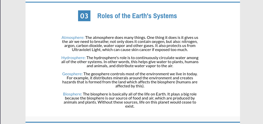 The Earth systems build upon each other. The pollution in air can cause an affect on water becoming warmer for example.