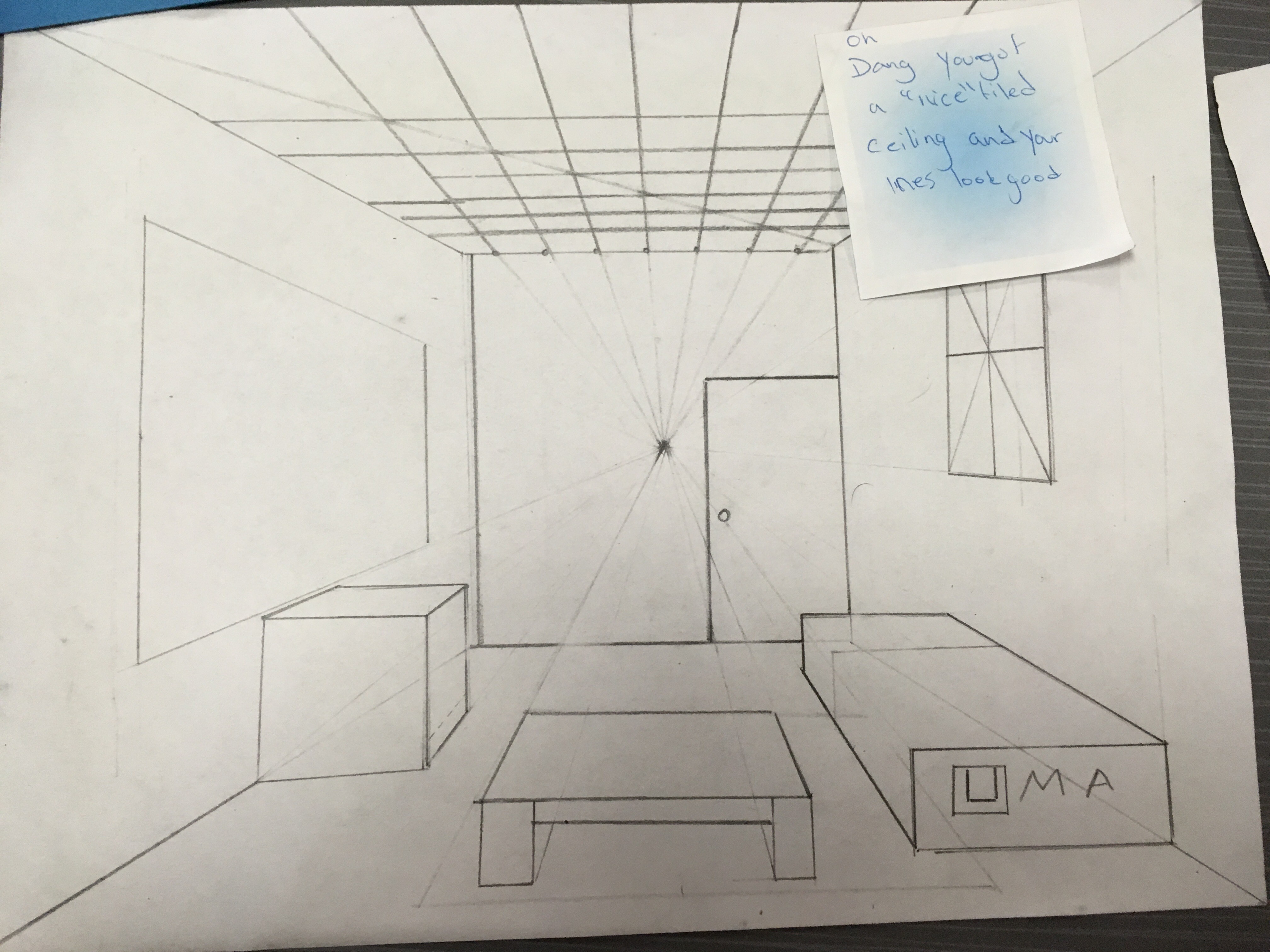 I learned that one point perspective is something that I see everyday. I just never noticed. I am most proud of how everything is a straight line. Everything in the room is a sharp line. I want to improve on detail, adding color would have been nice. One tip for somebody next year is to always use the ruler.