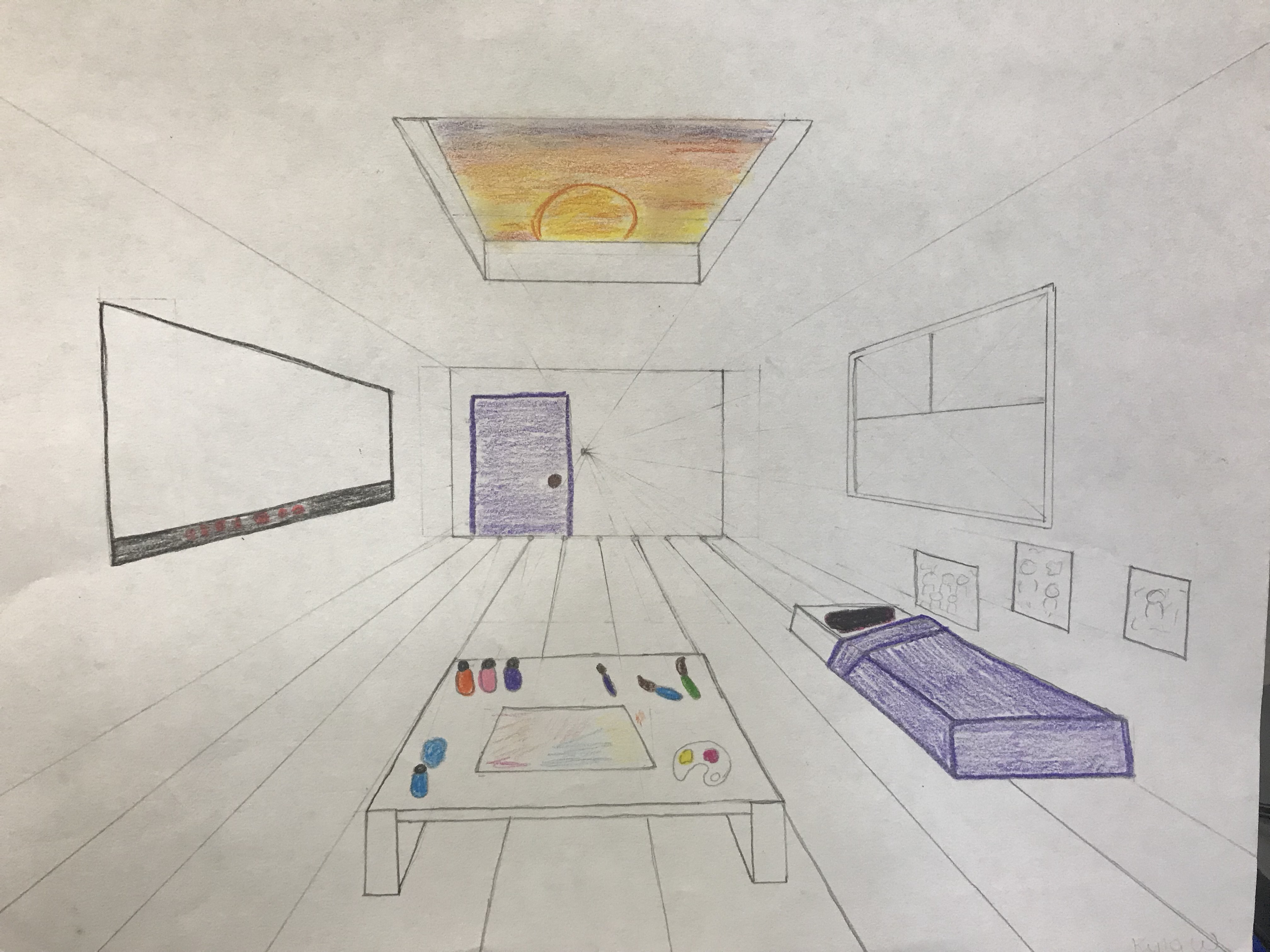 The room I drew was my bedroom. In my bedroom is a table with my paint supplies. I personalized my bed with coloring my blanket purple. And adding some pictures to my wall. What I learned about one point perspective is that everything goes back to the vanishing point. I'm most proud of the sunset that I drew in my skylight. I wish I could improve my tile floor and also make my lines straighter. One tip to have when completing this project is to always use a ruler.