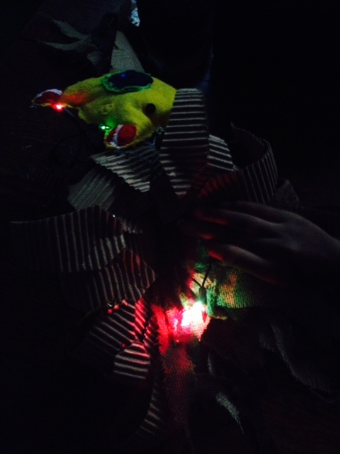 Lights were placed in the center of the flower to make it stand out, and lights were placed on the “ears” of the protist to allow it to stand out in the dark. The bright colors of the protist contrast the the brown cardboard of the flower, though in the dark it needed something to stand out, with all of the lights in the flower. It almost resembles a koala or cat resting on a flower. Its whiskers resemble a cat’s, though on the flower it could be mistaken for a koala climbing a tree.