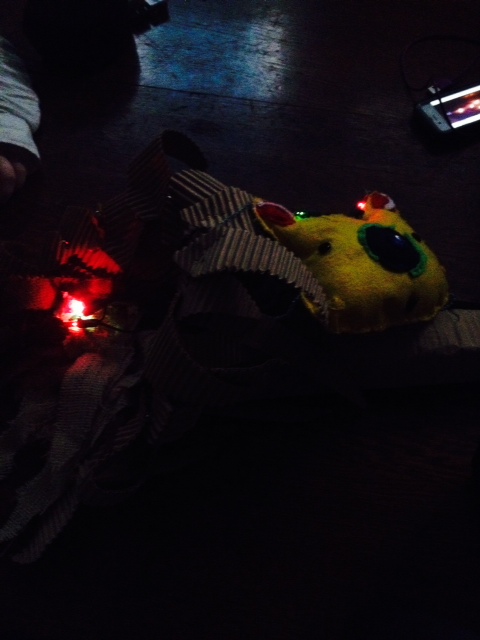 The objects we chose to use in our project were a cardboard flower which Jacqueline created, and a protist stuffed animal which Alyssa created. We chose to use these things because we wanted to use projects created in school that were meaningful to us. We decided to place the protist stuffed animal on Jacqueline’s flower sideways, so that we could set the flower down when lit. We tied the stuffed animal to the flower using the protist’s strings, because glue or staples might have ruined the flower, and tape would not work.