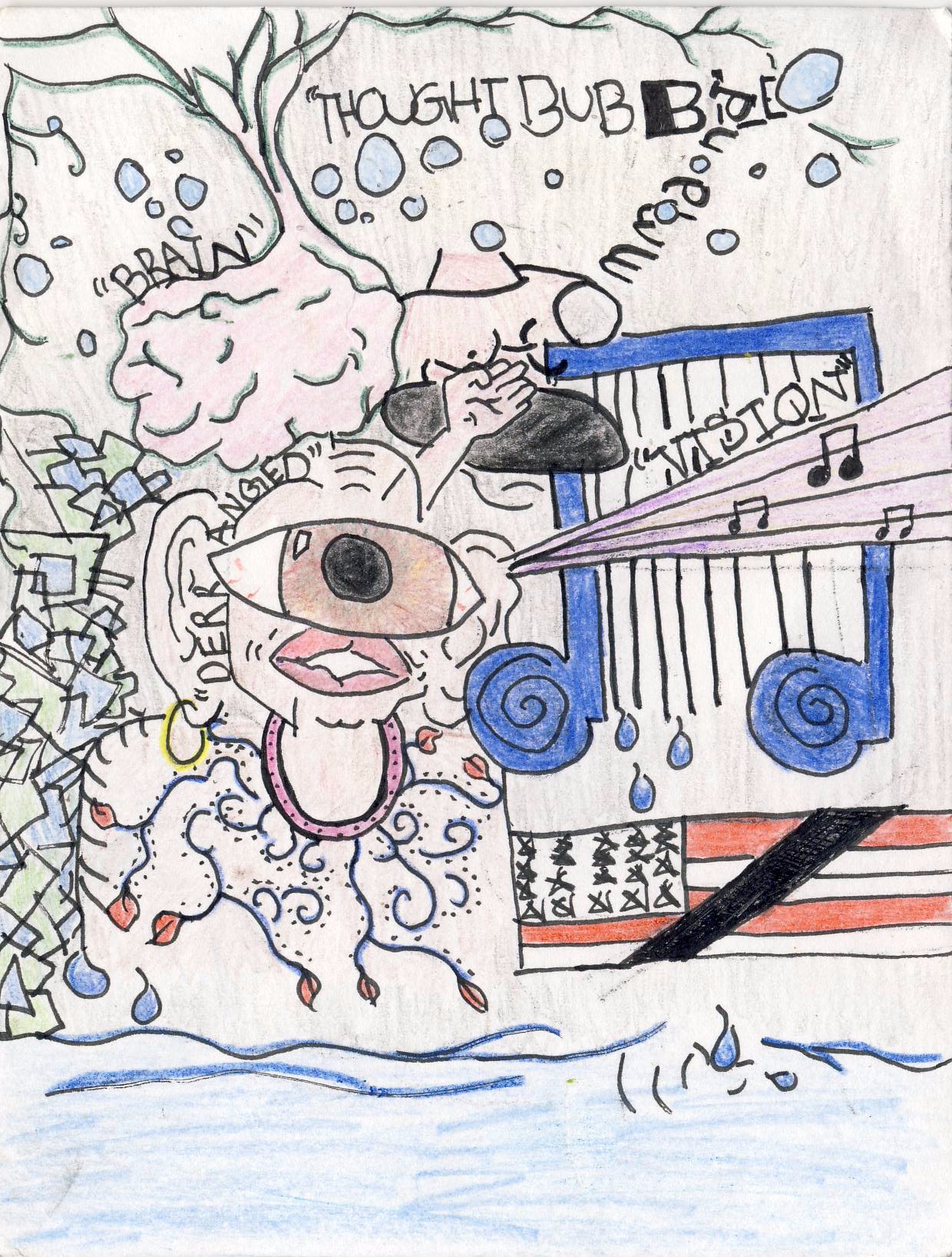 This picture features a portrait of me and the things I love and like around me. It starts off with my disfigured face in the middle of the paper. I filled out my lips the most here to focus on the meaning of communication and words and I also made a single eye bigger than the face to represent the future and the mindset I have in life. I made sure the body and head colors were true to real life so that the viewer could understand what I was trying to draw. Directly to the right of the head there is a series of music notes which represent my love for music and my passion for music. I made sure to run the vision rays coming through my eyes through the music note to show my focus on music.Then directly above the head is my brain which is outside of the head to represent out of the box thoughts and the bubbles are thoughts forming and flowing through the air or my mind. Everything in the picture ends up in a puddle that takes up the majority of the bottom half. This puddle is supposed to be me and everything that amounts to me.
