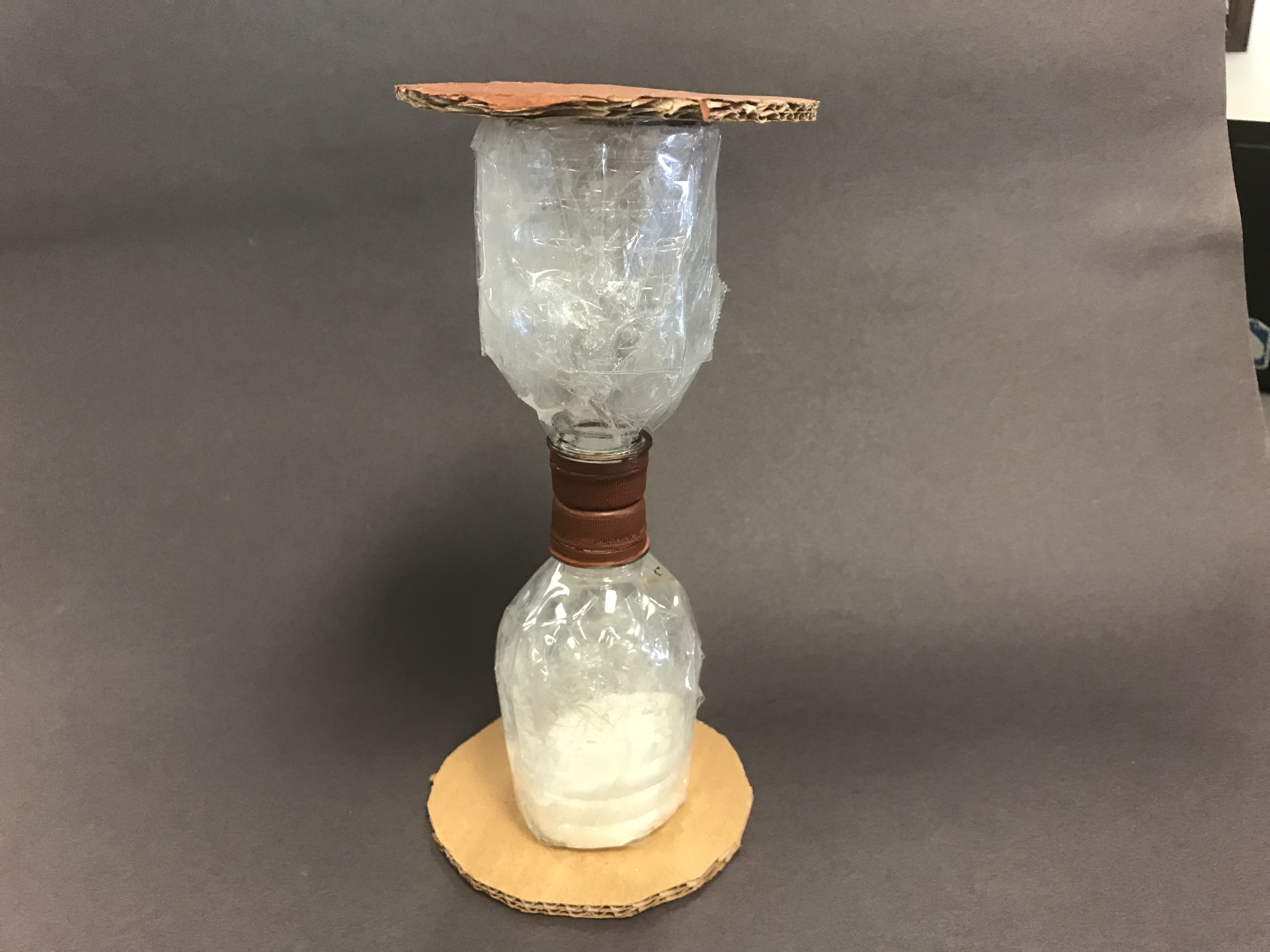 For my materials, I used two plastic water bottles for the “glass” portion of my hourglass and cut them in half to make a symmetrical encapsule. Once I cut them in half, I used saran wrap and tape to cover the the bottom and exterior of the bottles and give it a somewhat exquisite finish. I then carved a hole in each of the two caps to allow the sand-like material (sugar) to repeatedly pass through the bottles as much as necessary. I then used the hot glue gun to glue the two caps together to secure the bottles and prohibit any material from slipping out of the bottles. I then filled the bottles with the sugar and put each of caps on the bottles, and the hard part was over. Lastly, I cut two circles out of cardboard and glued them onto the top and bottom of the hourglass. This was meant to be the frame of the hourglass. I then painted the cardboard and the caps of the bottles and completed the hourglass.