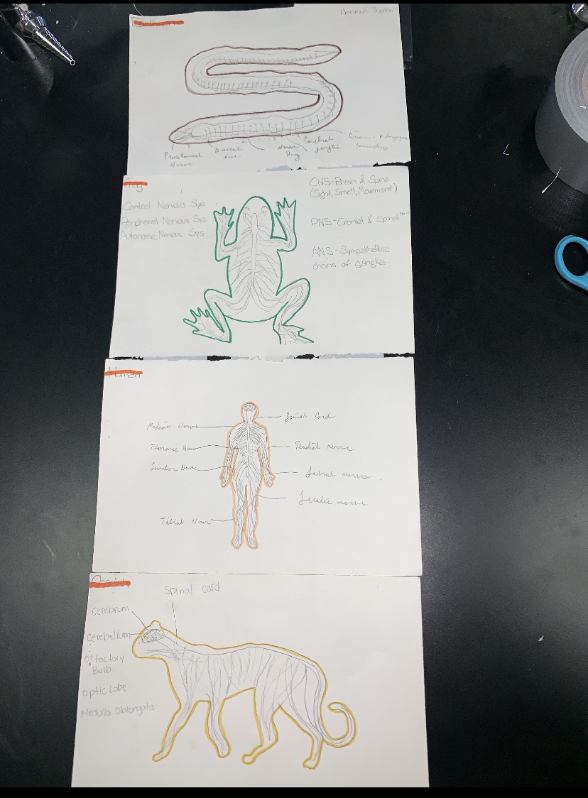 My group and I showcased a project showing the different Nervous systems within a worm, frog, human, and cheetah you can see a huge difference within the four living organisms and how some have totally different structures and you can also notice that there are similars in some of the living organisms.