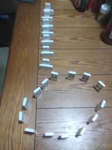 So for anyone who doesn't know, the domino effect is when you take one thing out of something and it affects everything. For instance, when you take a domino out of a line, the entire line of dominos won't go down. We used these dominoes to represent an ecosystem because if you take one thing out of the ecosystem, it would affect everything. For example, if you take away the sun, every living thing in the ecosystem would die. In fact, the entire world would die. You can say the same thing for water. Even if you take away a primary predator, it would affect the ecosystem as there would be an overabundance of a certain animal which could be bad. After doing this project, we feel like we learned more about not only ecosystems but food webs and food chains as well. We learned that the littlest things could have a huge effect on everything. Some things that stood out to us was the fact that some animals that you don't think are important to an ecosystem really are very important. For instance, we didn't think flies were important but if you take out flies, animals like frogs wouldn't be able to eat them which could cause frogs to decrease in population. Then animals like snakes would decrease and it would keep going and going. Something we are still wondering is can there be an ecosystem that isn't affected if we take something out of it.