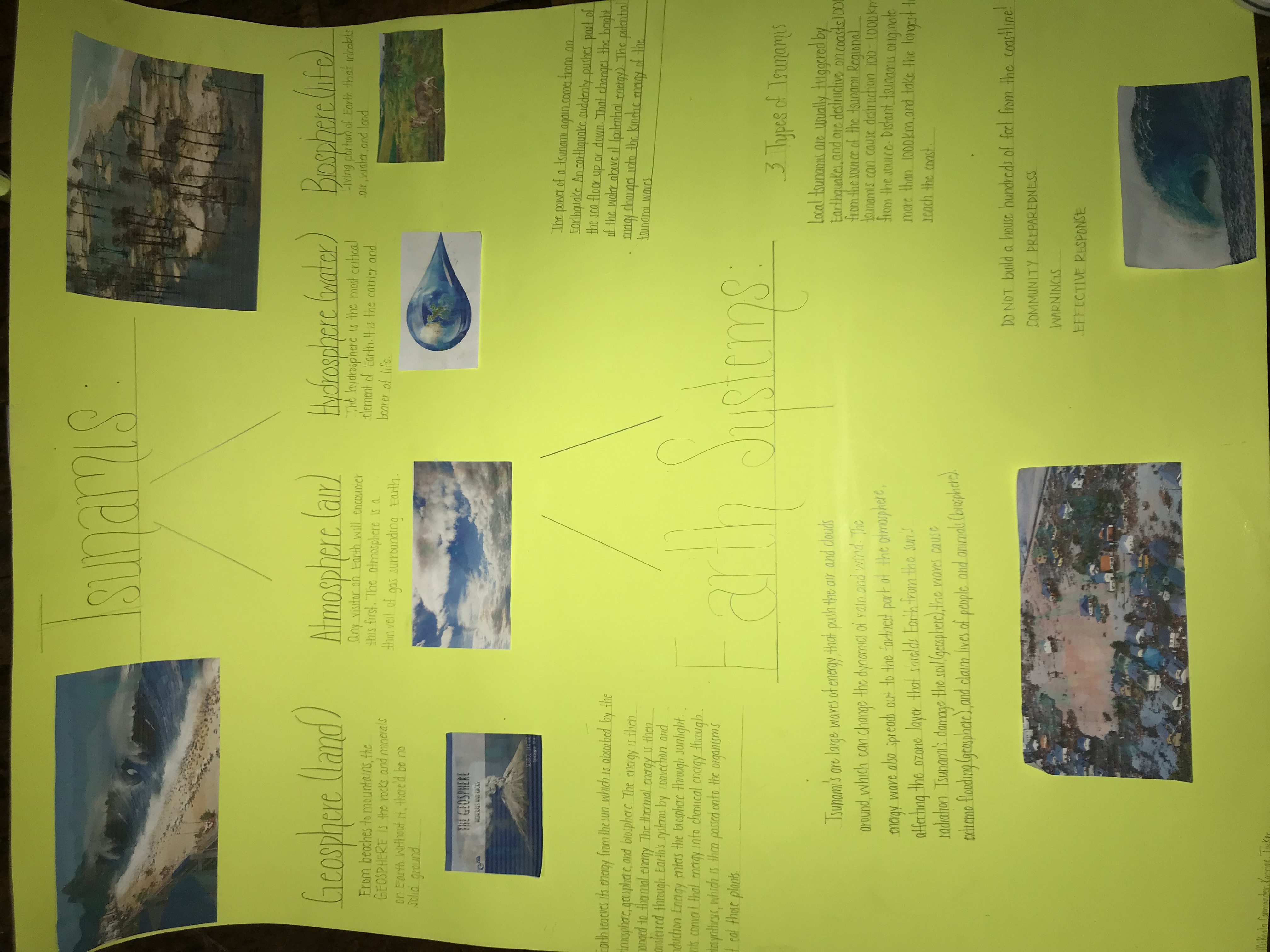 The earth systems affect each other because it’s a domino effect. For example, plants draw water (hydrosphere) and nutrients from the soil (geosphere) and release vapor into the atmosphere. Tsunamis affect damage the soil (geosphere), and waves cause extreme flooding. Understanding environmental science can help by having us prepared for whatever comes our way. We are able to forecast warnings for incoming natural disasters now with understanding of environmental science. In order to create a sustainable future, we must prepare for all things that may come our way. We have to ensure a healthy environment and in doing so, we must keep our place clean, ensuring to stop polluting and littering.