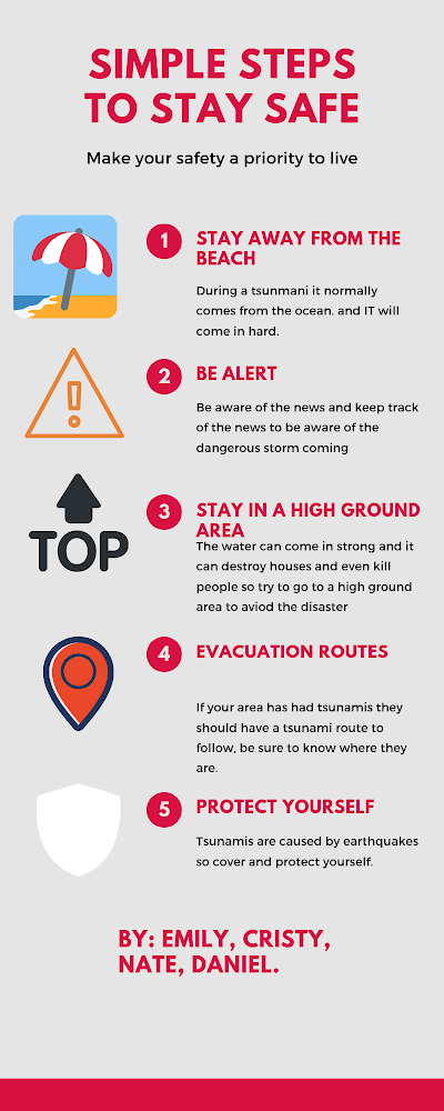 1. How do the earth systems affect each other? They affect each other by either supporting each other or having other things flow through them. For example, the biosphere, hydrosphere, and geosphere are all affected by forest fires. Forest fires destroy living plants, release carbon dioxide into the air, and change soil. An example of support is photosynthesis. The atmosphere carries the clouds, the hydrosphere is the reason for water being in those clouds, and the biosphere gets water in order to grow plants. 2. How can an understanding of environmental science aid in handling natural disasters? Understanding environmental science can help because people would be more well-informed, would know why a disaster is happening, and would know what to do when/if one occurs. 3. What efforts can we make to create a sustainable future? Definitely recycle and encourage others to do so. Going on strike for the climate could maybe work but recycling is a more direct defense against climate change. My reactions to researching this topic were pretty predictable. I knew how dangerous tsunamis were and I wanted to portray that in both of the visuals.