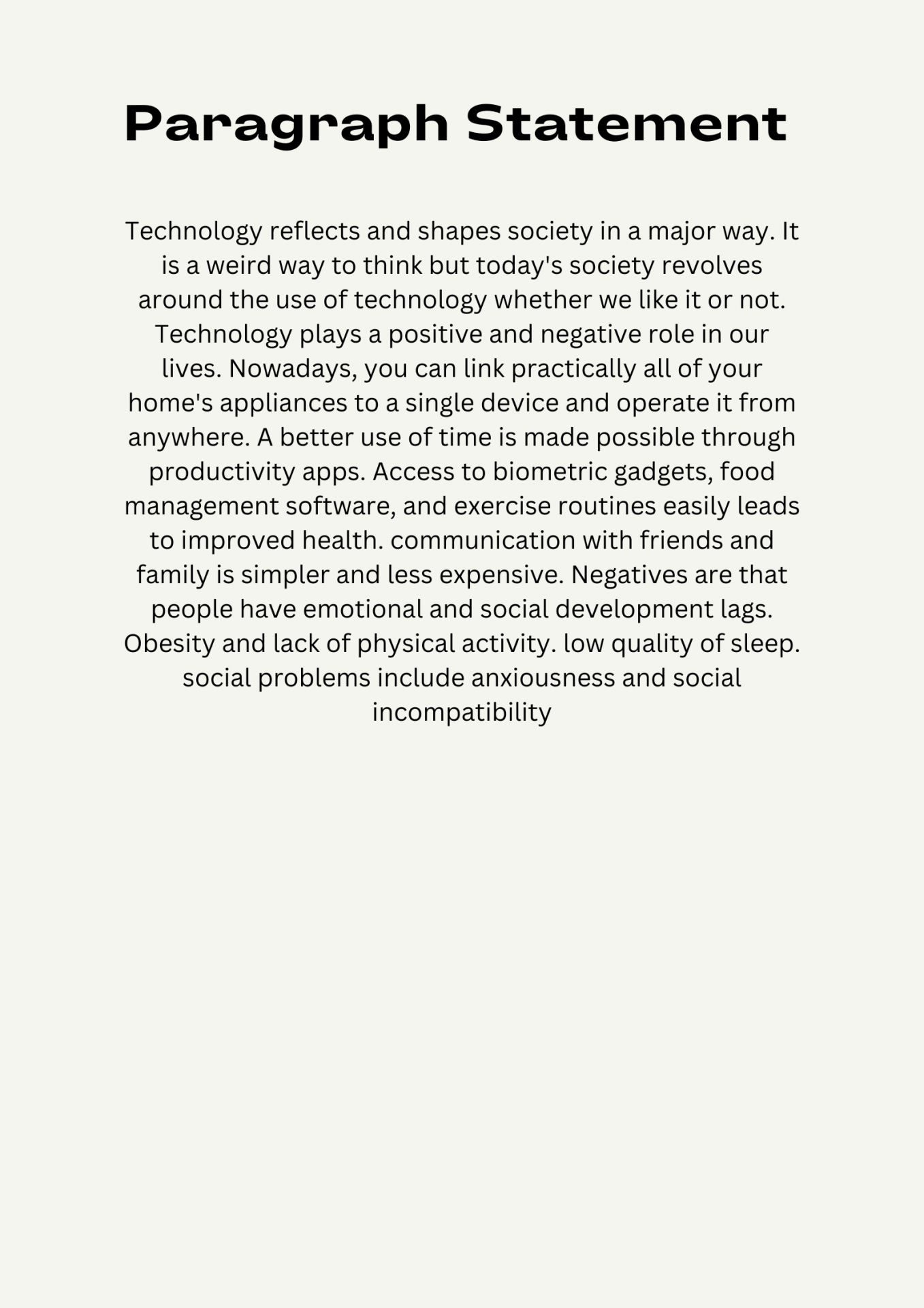 Technology reflects and shapes our society in many ways. Without technology there would be no life. It helps people think , communicate and learn. Tech and society rely on each other. Technology also improves our lives. Technology is used in everyday lives such as in work places , schools and to communicate with people . It’s also used to find information we need .