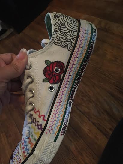 I had to learn what type of markers would be best or would not be. Washable markers did not work, so I had to use permanent markers like Sharpie brand. I also, learned that I had to barely touch the shoe when trying to design because the markers bleed through so fast that I couldn’t press too hard because the colors would spread thickly. I had to dab sometimes to make the marker come out thin.