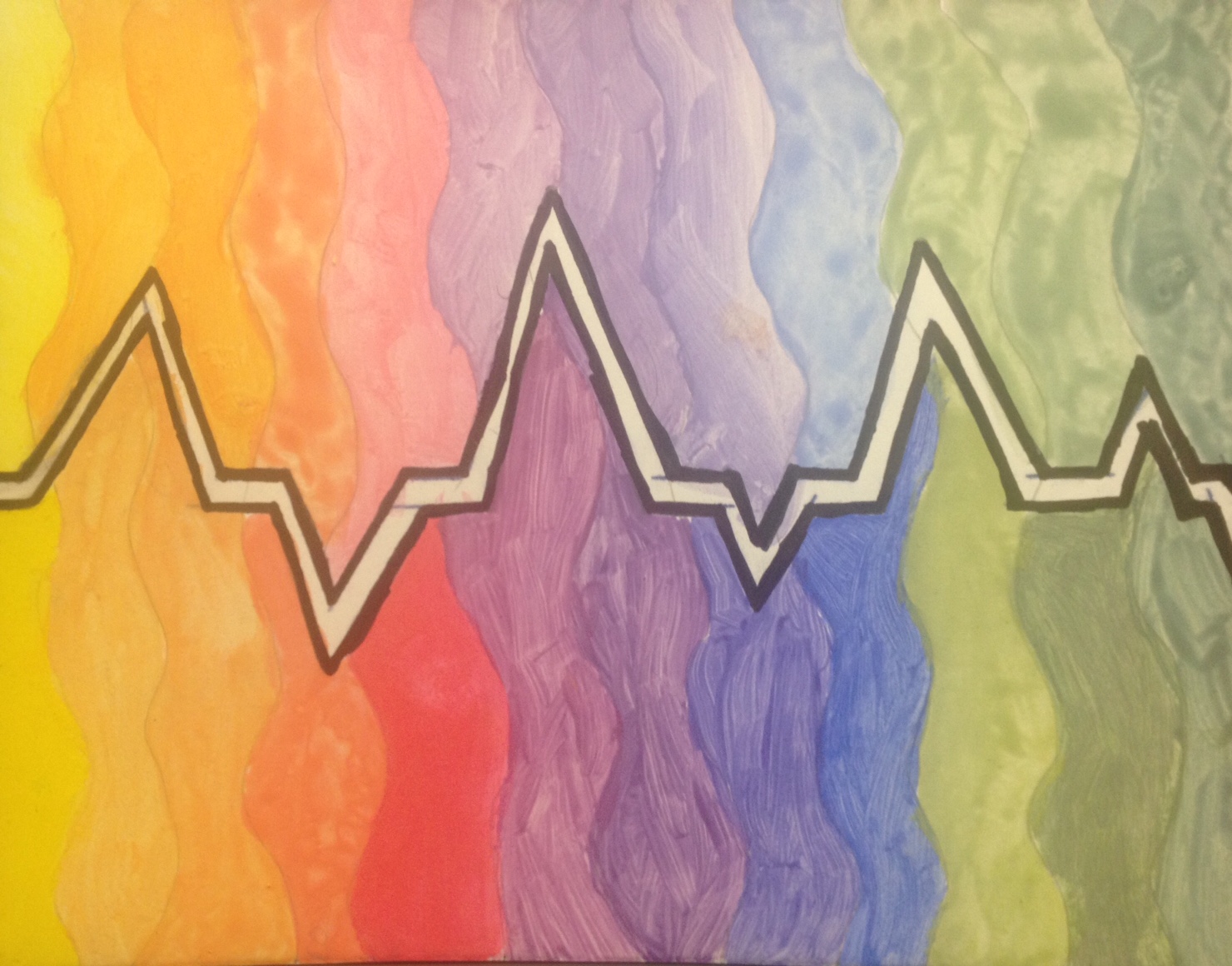 I’ve created “Emotions” because I’m highly fascinated in affective science (the study of emotions or affect) and colors. That’s why I took these two elements that are commonly used in art and made my not so much of a color wheel, but colors from the color wheel into a pulse pattern. When we have feelings, our body reacts to those feelings in different ways, we also tend to correspond those feelings to colors, Such as the color red. Anger. When you’re angry, your pulse-rate will quicken. Or the color blue, sadness. Your pulse-rate will slow down. Also Yellow, Happiness! You can be either way when you’re happy; I start moving quickly because I get so jittery!