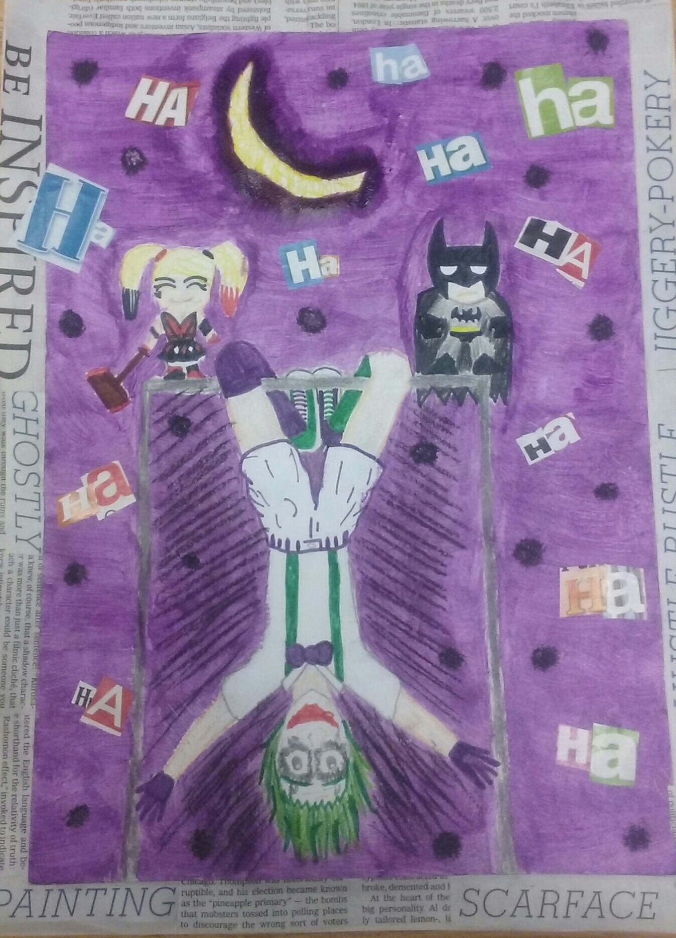 So for Quarter 3 I decided to do the mixed media project. I chose this project because I thought it would be awesome/look so cool if my drawing came to life with different mediums that’s not just paint. My vision was to have the Joker hanging upside down like that scene in “The Dark Knight”, but then I wanted Harley Quinn in it, But I didn’t have space for her… So she and batman became mini figurines, like their “Pop vinyls”. Before I started drawing I was gonna make Joker like a teenager, That’s why he’s dressed the way he is instead of the purple suit. The different mediums I used were: Paint, Markers, Colored Pencils, Charcoal, Newspaper letters, Magazine letters, and a Lead Pencil. Newspaper and Magazine letters were used for the “Ha Ha’s”, The colored pencils for their skin, parts of their clothes and the moon. Markers for parts of clothing, the moon, Charcoal for a like evil aura, and the paint for the background and stars. I feel as though the only way you can do good in art is to draw something you love or something that makes you happy, that's why this work compares to my previous ones. I always draw according to what makes me happy. When I started I had a totally different idea, didn’t like it so I trashed it. My inspiration for this was Heath Ledger’s performance in “The Dark Knight”. I loved his performance. Me and Joker have a lot in common, Laughing at stuff that aren’t really funny lol. To sum this up, This project was awesome, I feel like I could’ve added a bit more, but I just had little time with the whole starting over thing. I’m still marveled by this though, didn’t think I’d pull it off. Anyways, I hope you enjoy Just Joking. (Idk about the title...)