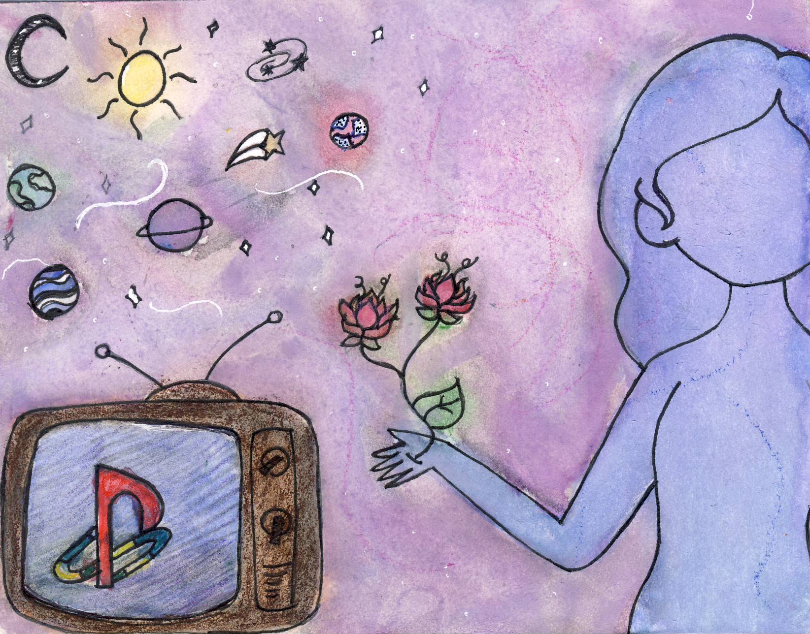 In my artwork, I used water colors, colored pencils, a micron pen, and a gelly roll (white) pen, to create a portrait that I felt expressed myself. I primarily used watercolors, because I wanted to try something new, but before I began to paint I used a pencil and micron pen to sketch and add line art to my portrait. After I finished with the line art I picked out the colors I wanted to paint with and mixed a few new shades of blue and purple together and used those colors to paint my silhouette. For the TV I used brown water colors but then I colored over it with a brown colored pencil because I wasn’t happy with how it turned out. Next, I painted the PlayStation logo, I started with a bright red watercolor and filled in the “P”. I decided to let that dry and started to paint my background, I wanted to create an atmosphere and feeling of space so I mixed together darker shades of blue and purple and blotted the two near each other. Then I some black water color to make it feel more like space but it didn’t look too good so before it dried I used a white watercolor to lighten it. Once all that finished drying I painted my planets various colors, finished my PlayStation logo, and flowers. Afterwards, I took a white gelly roll pen and added a few lines to my galaxy, filled in some stars, and added dots as small stars. Once I had done all that, the only thing left to do was go over my lineart with a micron pen again. This piece doesn’t really relate to any previous work besides old doodles. I don’t have a consistent art style, but for this project I wanted to keep it simple, while still having decent details.