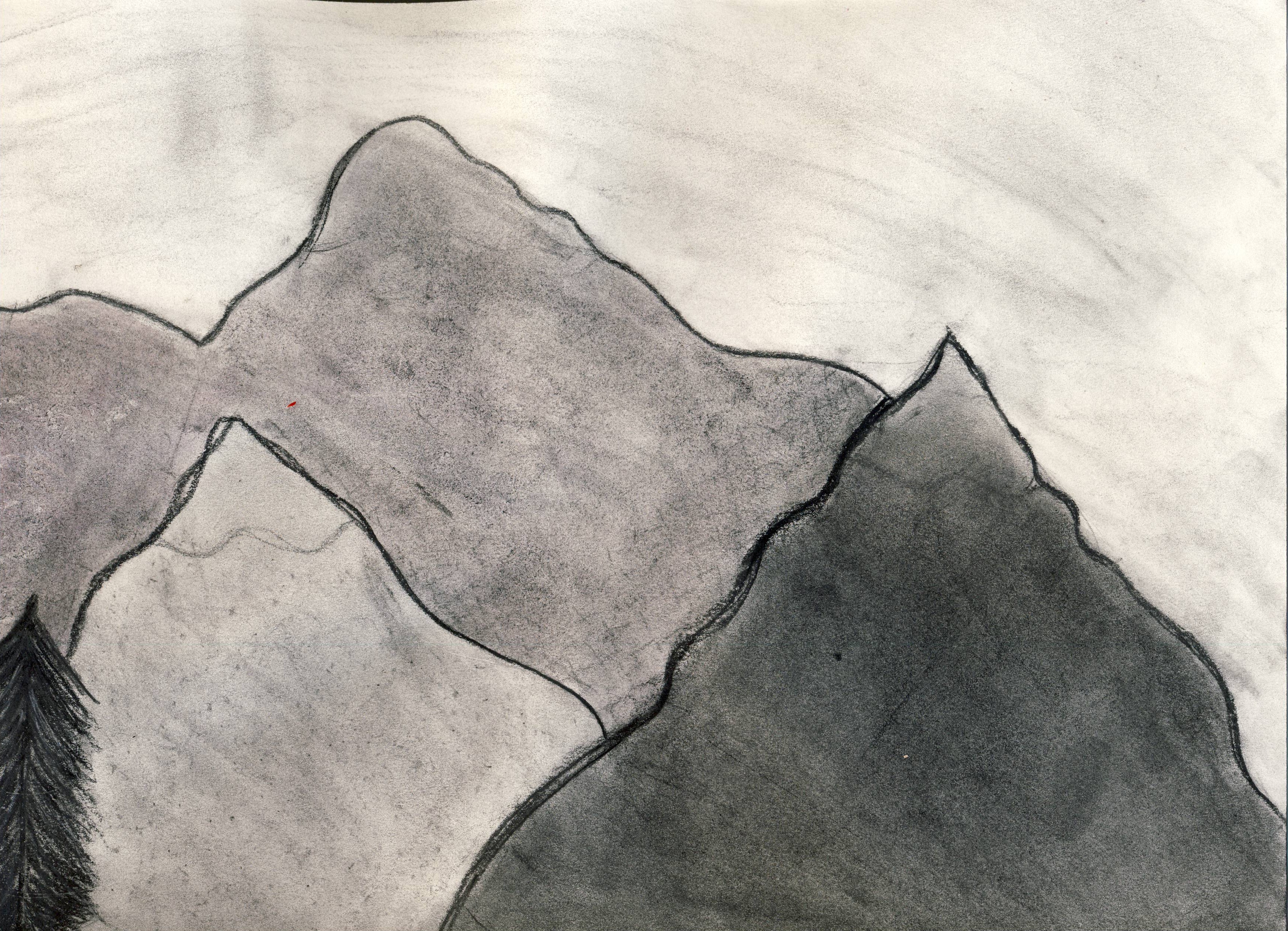 In the project I used charcoal to create an image of mountains while using different techniques to create various patterns and textures to my work. While looking at this you will see 3 mountains overlapping one another and a single pine tree in the very front, with a shaded sky. There isn’t really a story or anything that I wanted to convey, I just really wanted to draw some mountains. Originally for this project I wanted to draw a tree, or flowers, mostly a tree so that I could play with techniques and create different textures for each part, but in the end I decided to keep it simple and went with mountains.