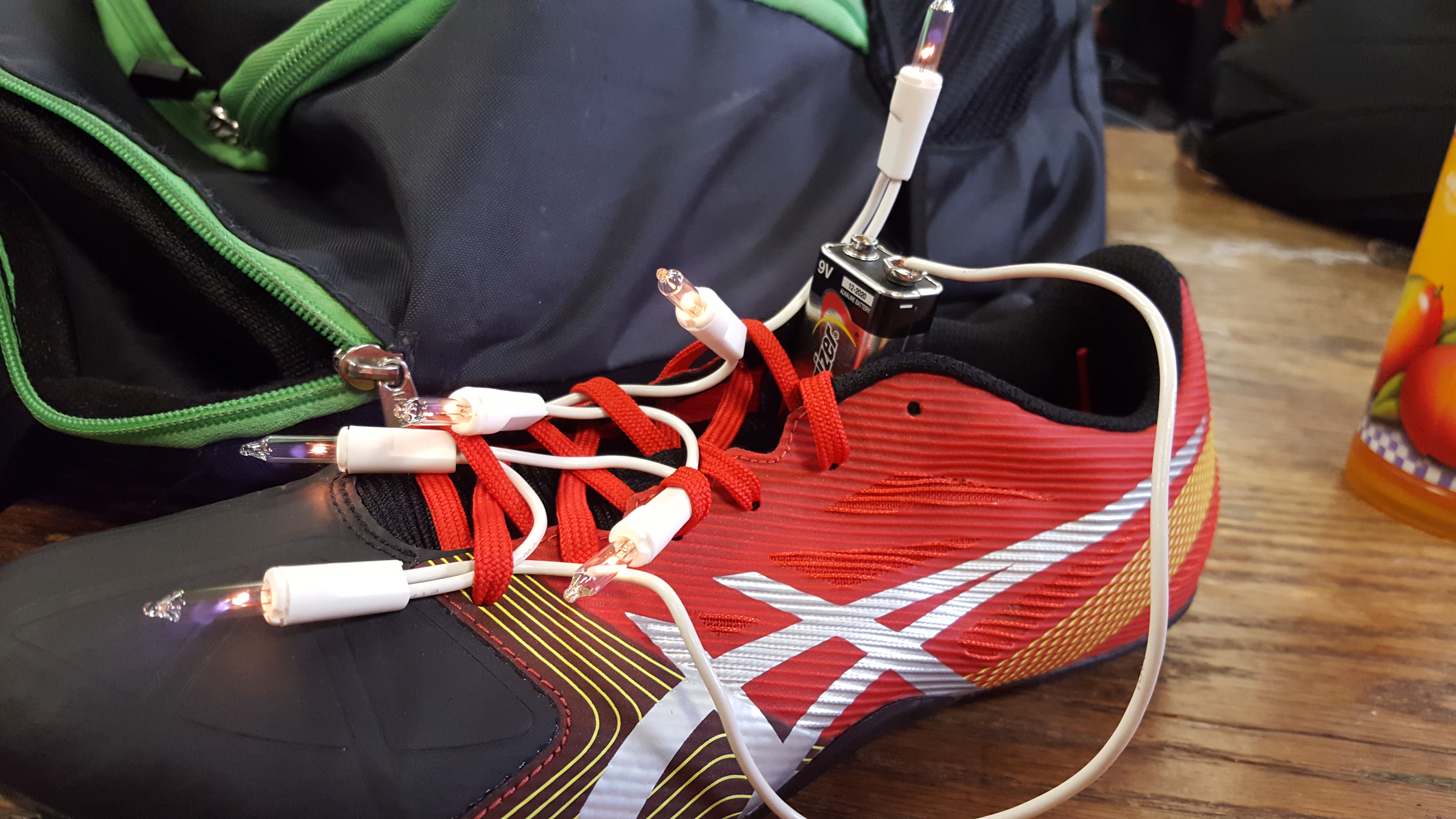 This is my very first track shoe that I used to compete in middle school track meets. I choose to use this for my benckmark project because I like to run track for a living and a track shoe is one of the most important equipment in track. This is because the shoes provides better grip or friction on the track allowing you to move faster and no risk for slipping. There are six bulbs in this circuit and they are in series with each other and are powered by a 9 volt battery.