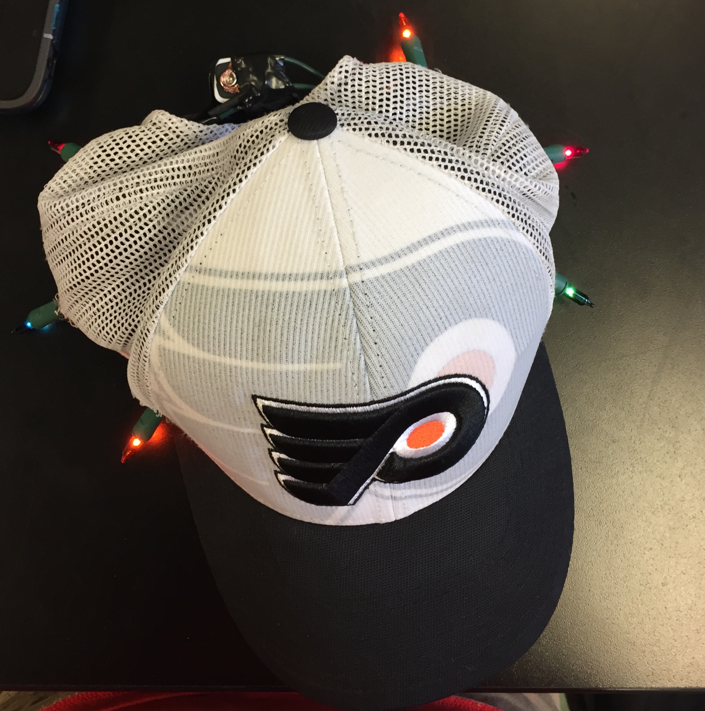 We put a parrel circuit of lights on a Philadelphia Flyers hat. The 6 lights are put on the inside of the hat and the battery is in the back. Now we made this for Flyers games so you can be the best philly fan in the world.