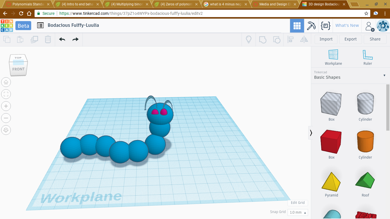 My project was made on tinkercad. I designed a caterpillar. I did a caterpillar for my little sister because she really likes bugs and I thought she would be excited. When I first started the project I watched some tutorials on how to do it. Then I started to design my project. A success I encountered was learning to move the pieces up and down. A failure I encountered was accidentally not saving the project, and I had to start again. Luckily I remembered what I did. In the project I learned about doing 3D modeling and how to use different tools to make different things. Something I learned about myself is that I am not good at computer programs. It is something that takes me awhile to get the hand of. I would watch more videos and try something more complex if I were to do it again. Since this is my first time, I think I took the easier root. I made something easier then others made. A tip I have is watch a few video tutorials on how to work the program you are using before you start so it is easier. This project has inspired me to try to use the 3D printer next time. The tool did not have any specific thing to help me convey the message. I personally feel I could of done this on any 3D modeling website.