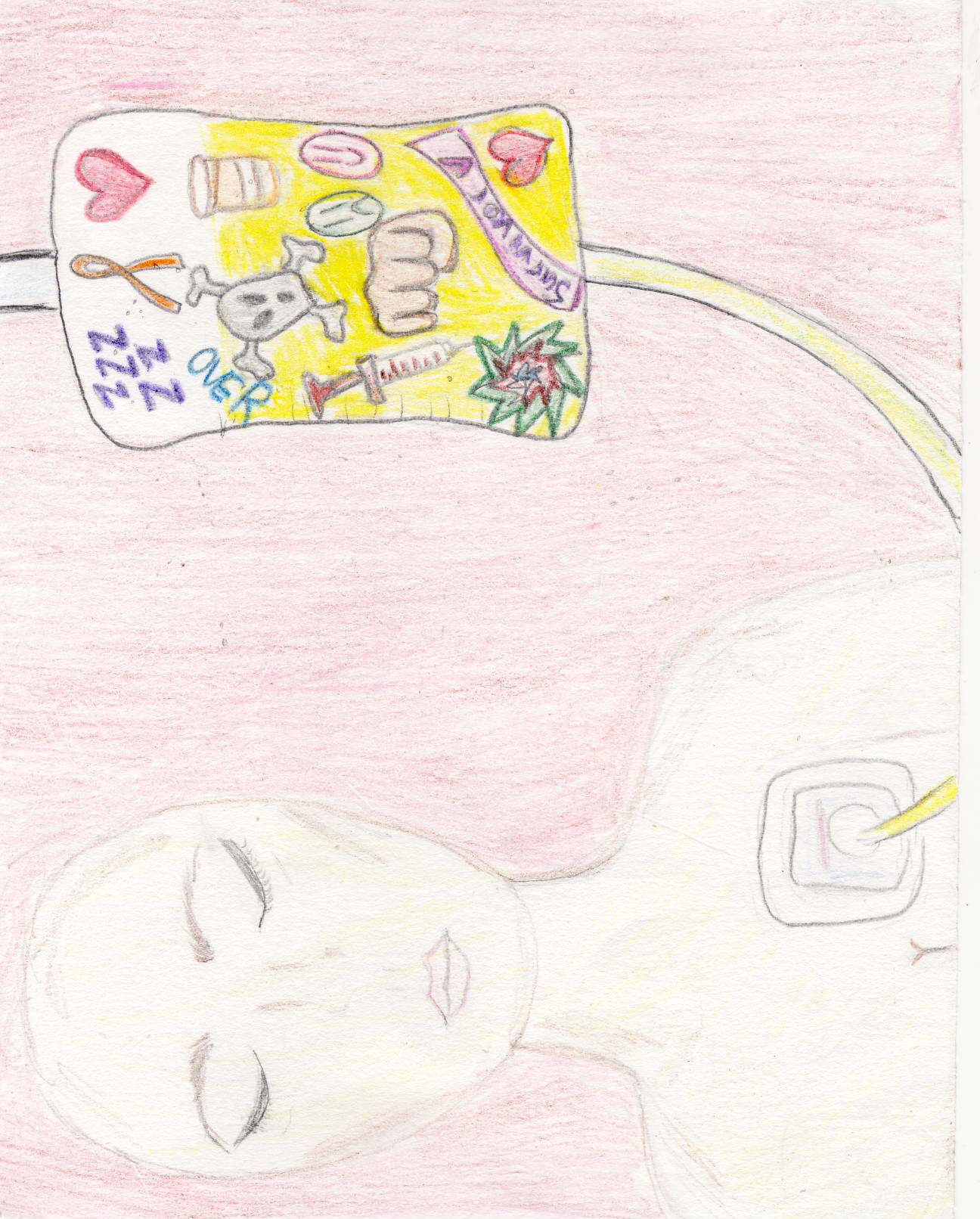 I drew the litle explosion spark to express me going crazy. I drew the skull to represent feeling so “dead” and out of it. I drew the heart because I was grateful for the expirience and meeting the people I met. It shaped me into the person I am today. I drew the “zzz” to represent how tired I was physically and emotionally. I drew the first pump to represent me as a fighter. The shot and pill bottle was to represent treatment. The upside down over represents me being over with it. The happy and sad face represented my moods changing often about things. And lastly the survivor ribbon represents me being a survivor.