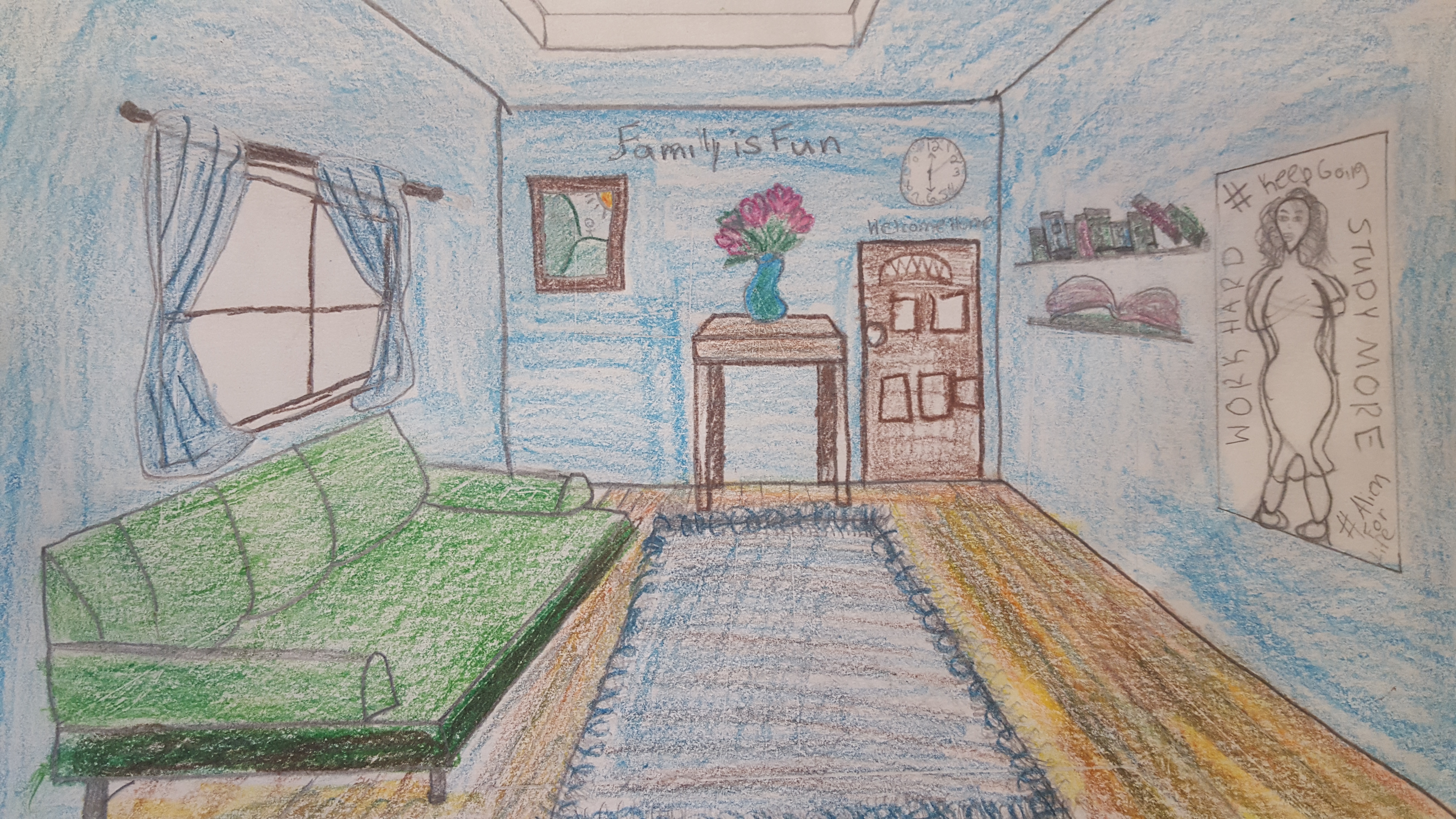 The room I drew is a regular bedroom. I learned about one point perspective from Art class. I am most proud of the poster on the wall and the colors I added to the picture. I could improve the texture of my wooden floors in my picture. One tip is to make sure your lines are straight.