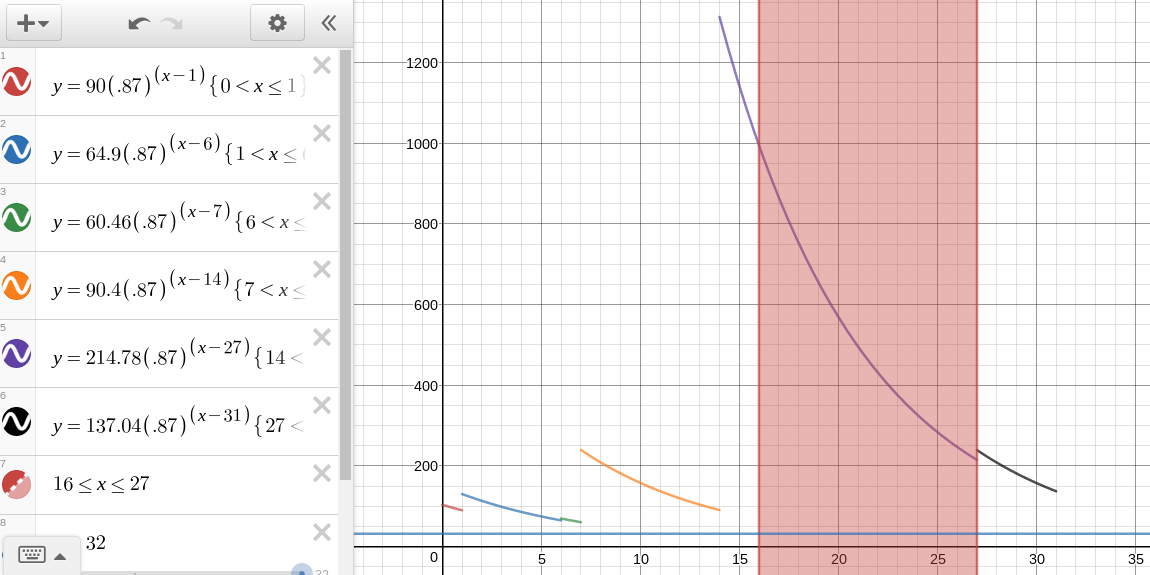 This kind of graph is called a piece-wise graph. This is where the function changes, making the graph “jump” from, in this case, one y-value to another. This piece-wise only shifts on the y-axis because x is representative of time, which can’t be skipped or altered. “x=32” represents where caffeine would no longer affect the body at all. “16≤x≤27” shows where I slept, from 10 o’clock pm to 9 o’clock am (I was tired okay?). The functions themselves are in a specific format; y=a(b)x. In an example of the equations that I had it would be; y=90(.87)(x-1). In this case, “90” represents the amount of caffeine I started off with after drinking the first drink. “(.87)” is the multiplier, it’s the difference of the removal of the the 13% from each hour. “(x-1)” represents the exponent that is the number of hours minus the difference from the starting hour (6 o’clock am on the first day).
