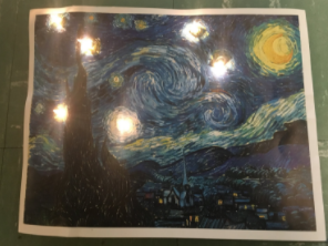 This project represents me because i have a huge interest in art and vincent van gogh is personally one of my favorite artists. I chose to do this for my project because i liked the way that the lights represented the stars in the painting at made it look really pretty. In addition, i thought it would be a clever way to put together a circuit, and a fairly straightforward project idea.