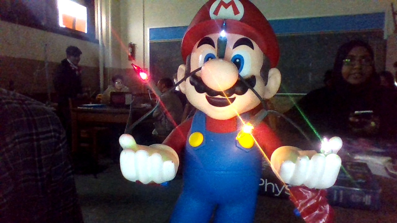 Taped to Mario's back, there is a 9volt battery, and a switch. There are festive lights around Mario's neck and hands. I carfully cut a section of lights from a big strand of lights. Since there was bare wire, I had to cover it up with electric tape.