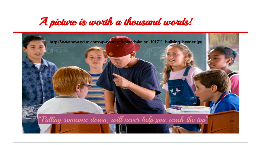 Why do people Cyberbully? People Cyber bullying for the same seasons as any other type of bullying. “Putting someone down, will never help you reach the top”. I chose this quote because Some people become bullies because they were bullied before and so they think is a way of solving what they went through, or because they see it as way of getting popular. There are many ways of stopping cyber bullying such as talking to your parents, consulting someone you trust. like your best friend, your teacher, your school counselor, your sister… or deleting your account. My advice for cyberbullying is facing the bullie, standing up for yourself and showing them that you're not someone that he/she should be picking on.
