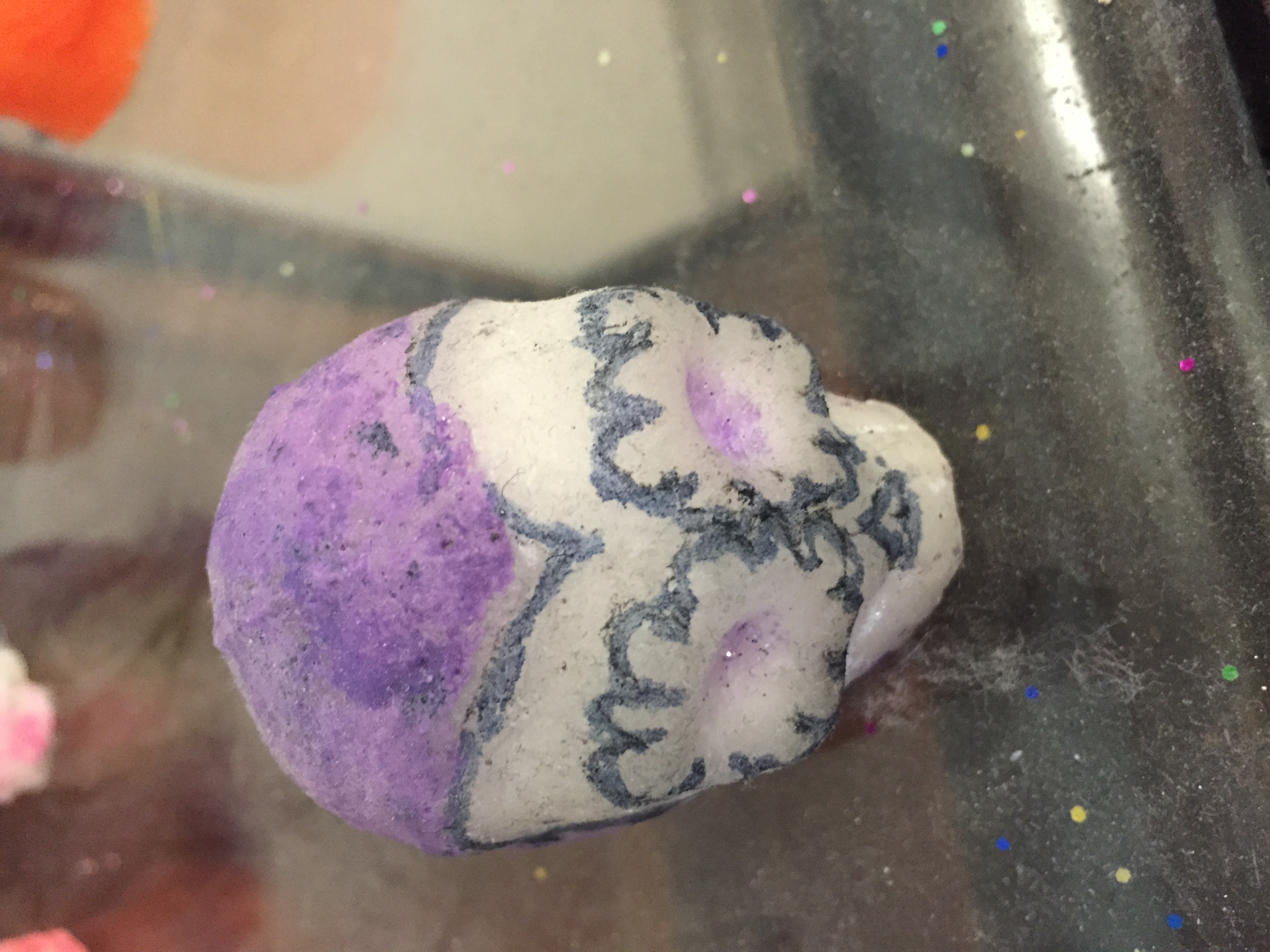 Mi cráneo es para mi primo. Lo he hecho porque mi primo le gusta púrpura y azul. A ella le gustar flores. Puse flores en él .