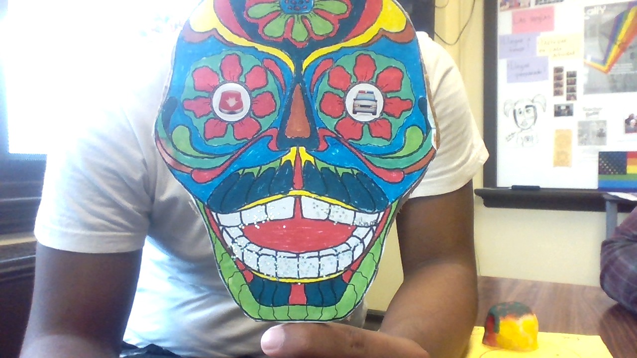 On this project we decorated a mask and a candy skull in remembrance of someone we lost. We also wrote a eulogy about the person we made the skull and mask for.