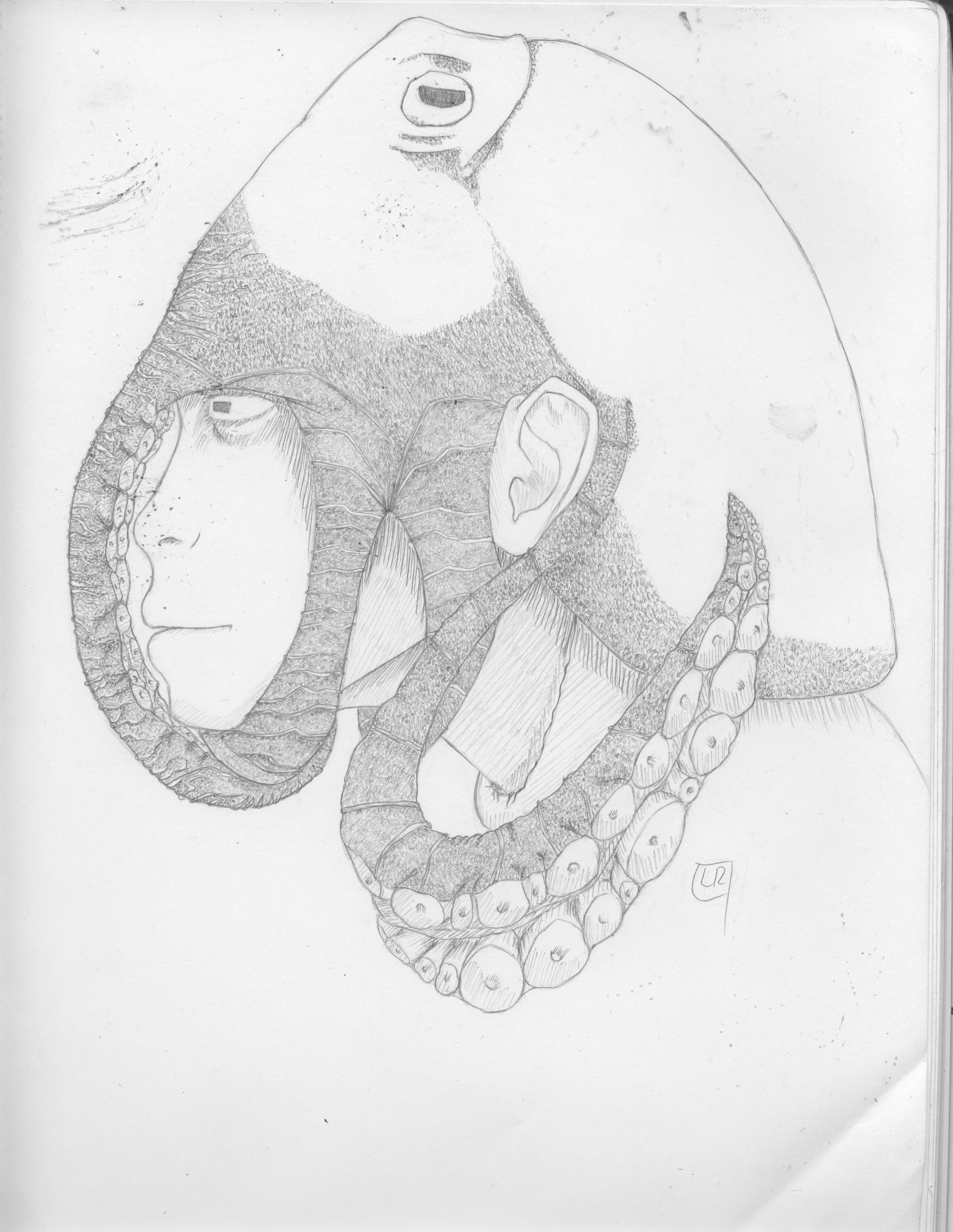 The way I made this is not particularly different than the way i’ve made other pieces, I quickly drew a profile a female and then pulled up references of an octopus, and drew from those to get what I wanted for the piece. I used stippling and crosshatching all along the octopus to create the rough surface they have on their skin, and kept refining my linework until i got to the product I have now. The most important technique used here was stippling which took the majority of the time to do but i’m satisfied with the overall effect of it.