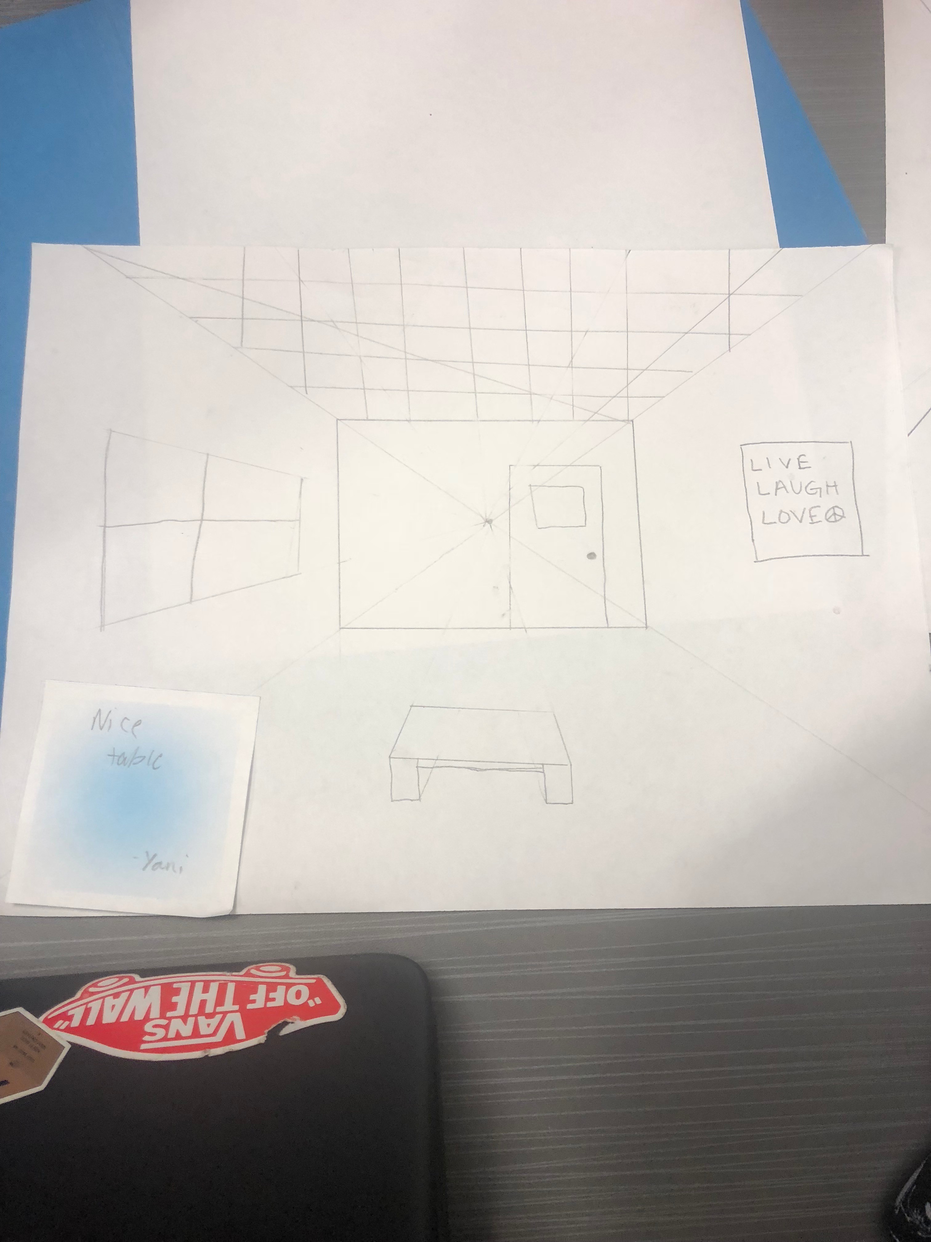 The room that I drew had a tiled ceiling with a slanted window, a door, a poster, and a table. I learned how to draw furniture that's 3D. I am most proud of the wall with my door on it because it is straight and neat. The only thing I really want to improve is the finishing touches on it because it looks a little sloppy. Use a ruler if you need to do this project.
