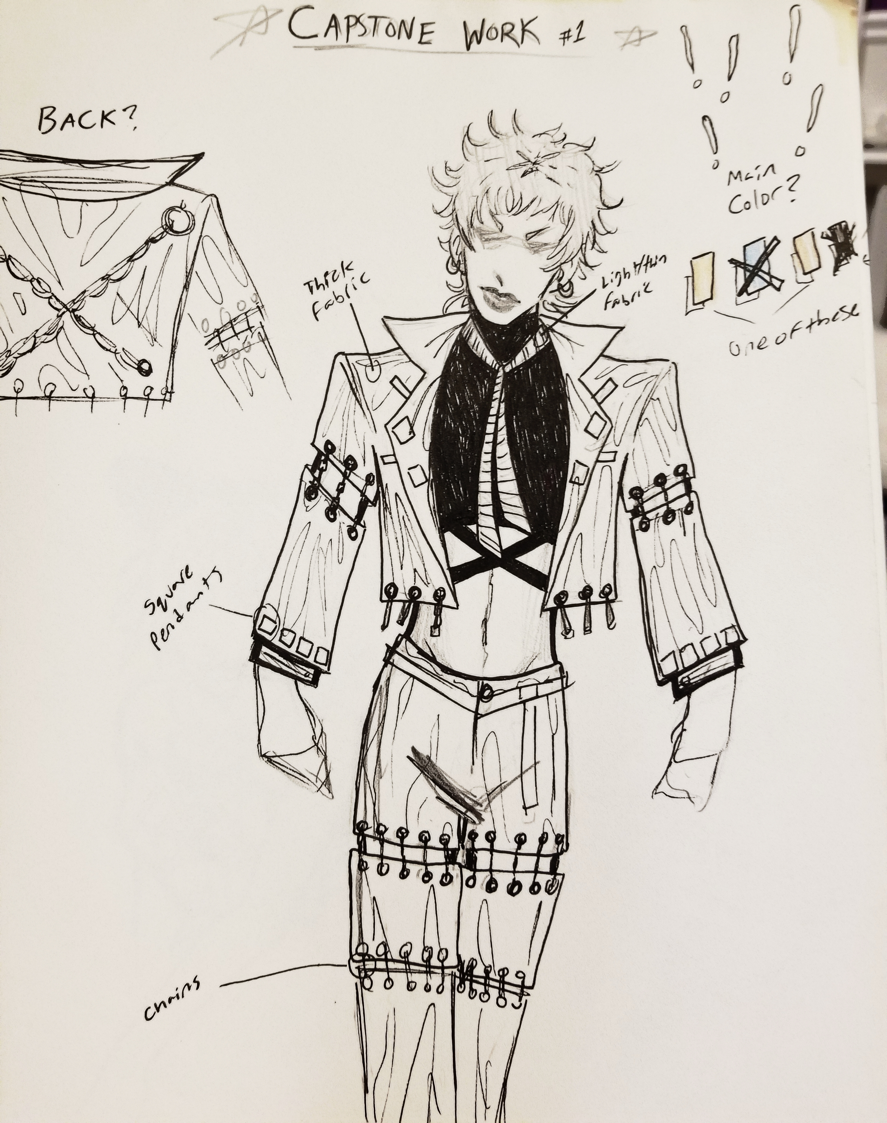 My process for this project was interesting. When this started, I had a completely different idea than what I ended up with. I went from considering a hospital internship to leaning into my artistic side. My project ended up being a portfolio of sorts. My main focus was to design an item of clothing and make it using a sewing machine, which I accomplished. I felt that this wasn’t enough for my own personal project, so I created a small website portfolio with other forms of my art. This includes traditional drawings, digital art, painting, etc. This project allowed me to appreciate art more, if I’m honest. It had always been a big part of my life, but until now, I hadn’t really created any sort of portfolio. It allowed me to look at my own art in a new light, and I appreciate that. (Original design for the jacket I made below.)