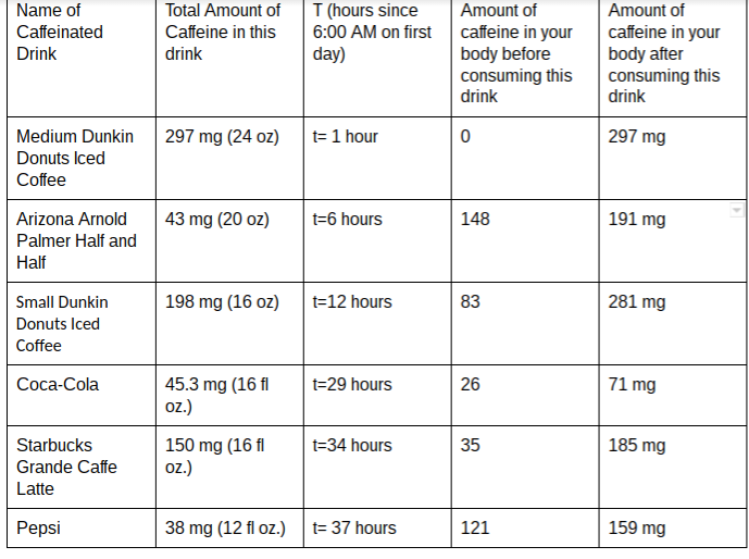 The following table shows how much caffeine was in my body each time I drank a new caffeinated drink: