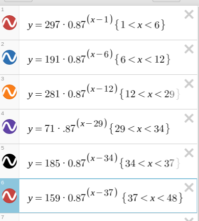 As you can see I used the exponential equation each time I consumed caffeine. For each new equation the ratio of change is 0.87 because that’s how much caffeine is left in your body in each hour (13% of caffeine leaves your body every hour). The exponent in the equation I subtracted the number of hours since the start of the day by T (x). I used the curly brackets to show how much caffeine decreased each time I drank something, to show when it stopped.
