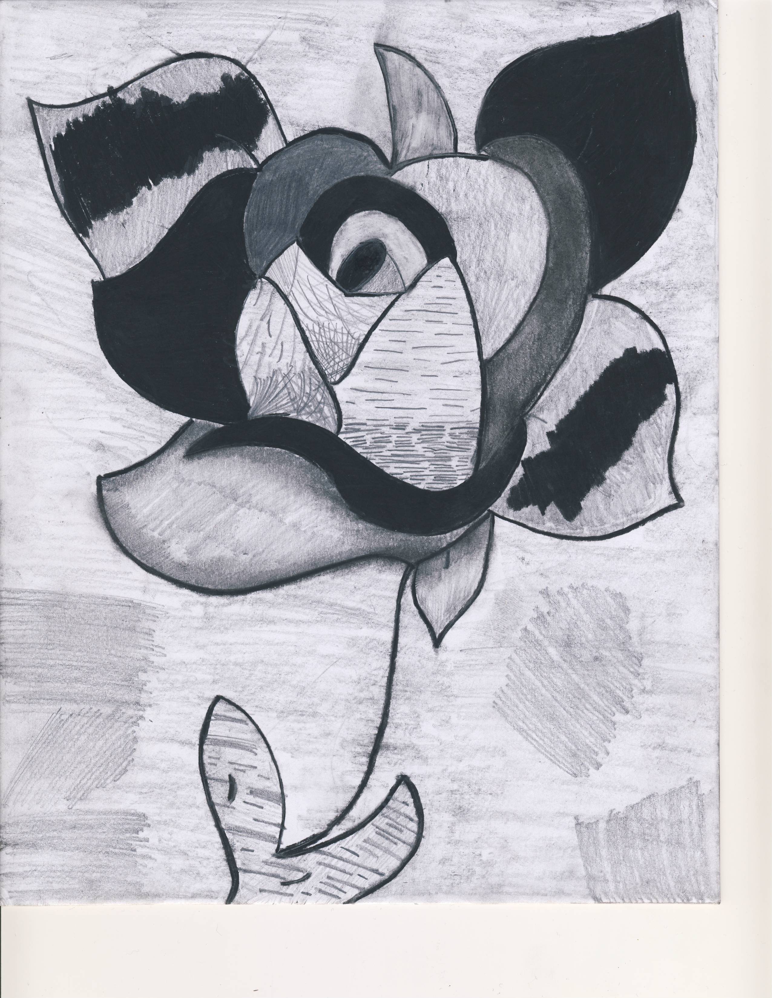 The process I used to create my artwork was youtube because at first I couldn’t do it, but I followed the out like to create the other part of the flower and within the inside I created my own petals. To make the dark spots on my rose I used charcoal and the light spots I used a pencil and held it different ways to get a different effect.Some ways my artwork can reflect my life is I have had some bad and some good the dark represents the bad and the light represents the good. The techniques that were so important to my work are the form of holding the pencil and pressing down on the charcoal , if you didn’t gold the charcoal the correct way you could mess up and smear it everywhere and if the pencil blended with the charcoal it would look messy. The techniques I used that were and experimented on that was new to help me create my artwork are the charcoal and drawing the texture which was cross hatching. My artwork connects to the real world such as the world we live end because the world is getting very dark and the things that are helpful to the world will soon be taken away because of the dark mean hearts around us , there are only a few people who care left.