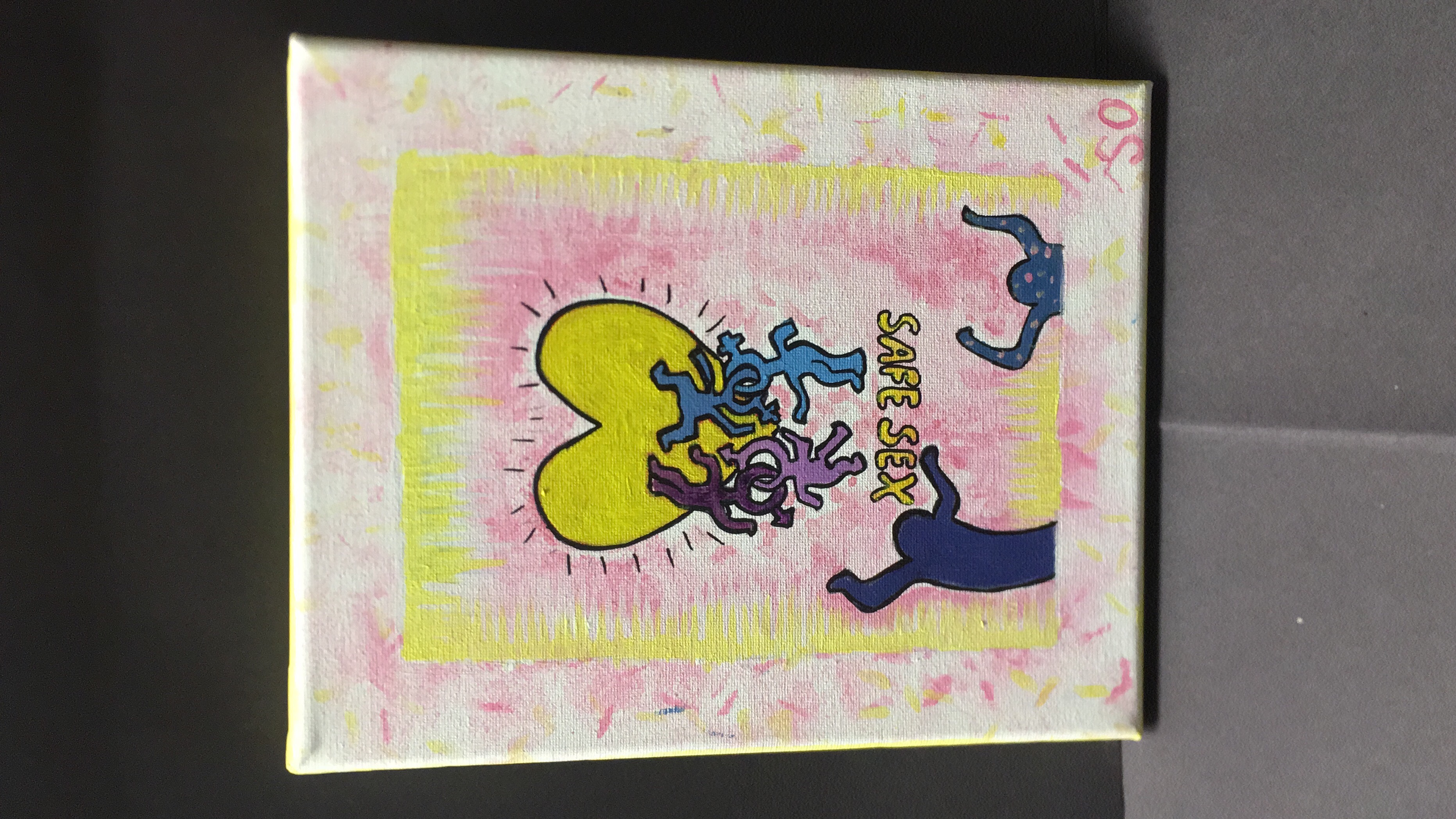 I struggled with this piece quite often. I wanted to also incorporate his “Ignorance=fear” piece, however, I still have trouble with painting words. I was able to paint “safe sex” on the canvas since it was a more abstract font. Unfortunately, you can still see the black marker at the top of the canvas where I made the attempt to write “ignorance=fear.” To cover this to the best of my ability, I made yellow and white spike-like brush stroke marks. There’s also pencil marks in some spots that I was unable to erase.