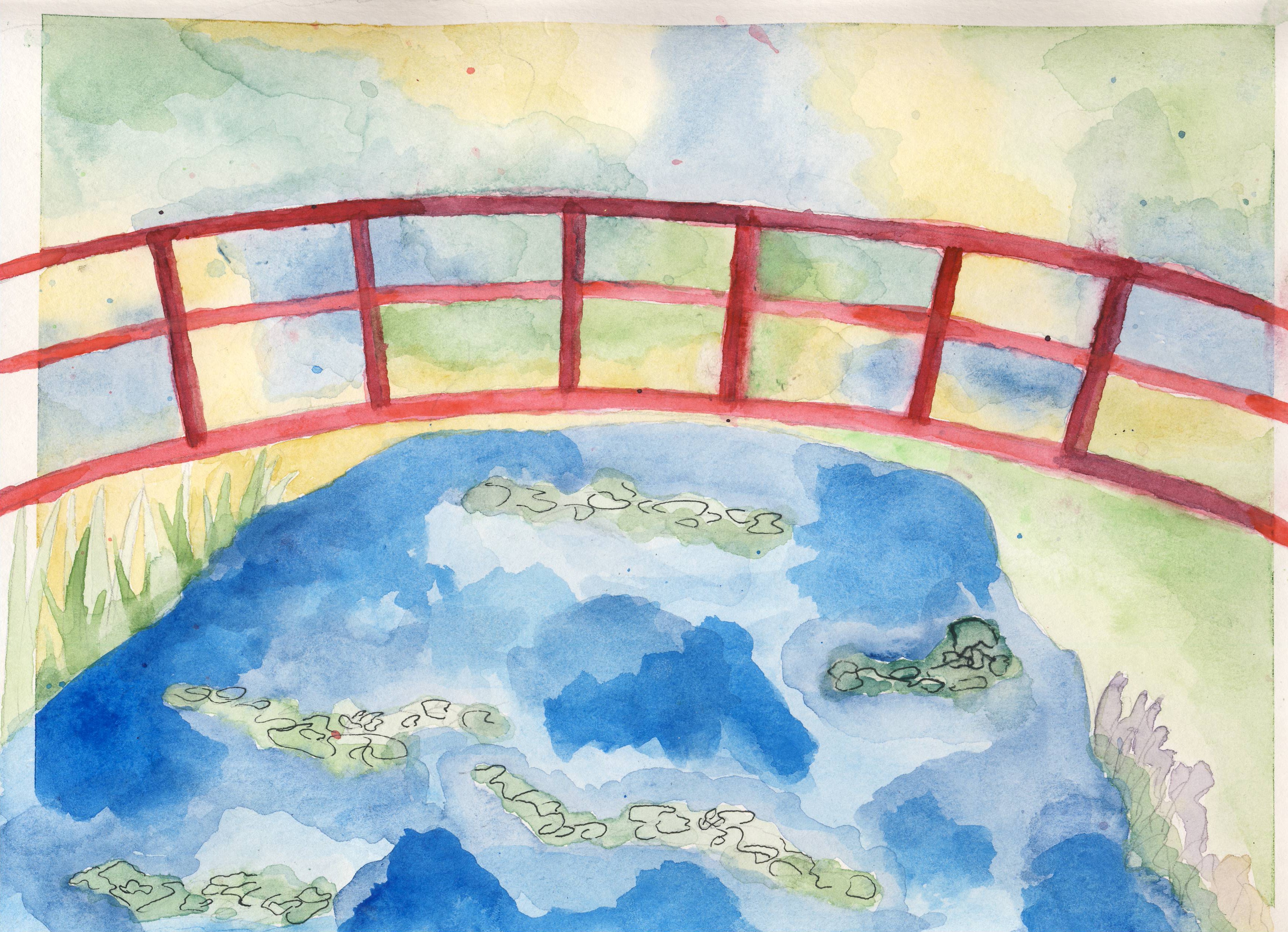 My first step was to do brainstorm what I actually wanted to draw. I did two outlines of my final product but both were at different angles. One being close up while the other being zoomed out and showing more of the landscape. I ended up choosing the close up perspective of the bridge. I then started to do my rough draft and figuring out different color combinations I wanted to try. This was followed by me starting my final piece. I first did a light wash of the base color and continually started to layer color on top of color to add more depth. This project was inspired by the artist Monet, specifically this artwork which can be found here.