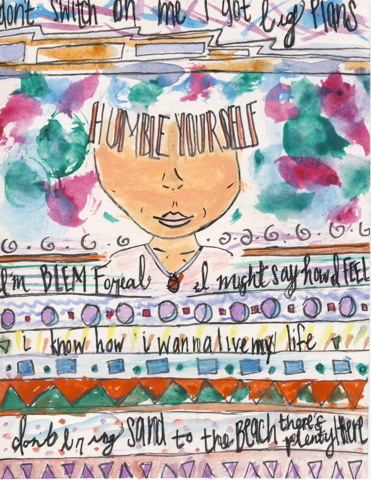 First, think I did made a couple sketches and until I found details and pieces of each sketch that I wanted to be in my final product. Secondly, I gathered all of the supplies I wanted and needed for my piece. I then started to draw on my paper with a light-handed pencil stroke for each pattern. While I was sketching the face and finalizing all patterns, I was also testing out all of the water colors that I was going to be using for my artwork. I made my own colors mixing and matching while also using some of the normal colors in my watercolor tray. I started to group colors that I liked together and imaging which colors I was adding to the patterns and started to mix my human’s skin tint. Finally I started to mix colors and apply the colors as I felt necessary.
