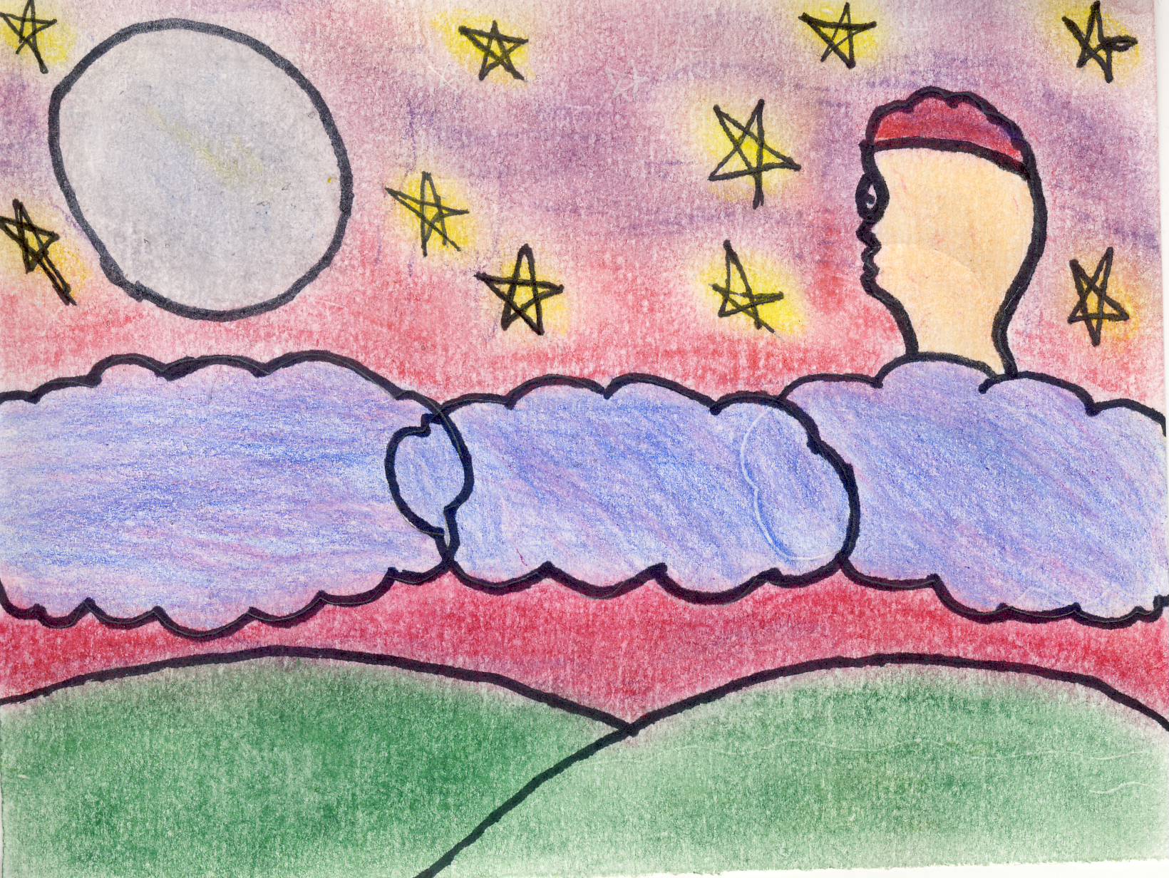 My artwork contains a faded green hill on the right hand side of the paper and it overlaps the darker green hill on the left hand side of the paper. Above the hills is a reddish purple color for the sky and then there are three clouds. They are outlined in black and are colored with purple and blue for a blended look. Coming out of the cloud on the right there is a head with their brain exposed. The brain is the same color as the lower portion of the sky and the person is looking at the grey moon and the yellow stars in the sky. The sky above is a light red that is fading out. I want my work to communicate my hope that I had to visit space. The person is coming out of the clouds because their head is in the clouds making it a dream like state. Which is why the sky is red when the moon and stars are out. It is not reality.